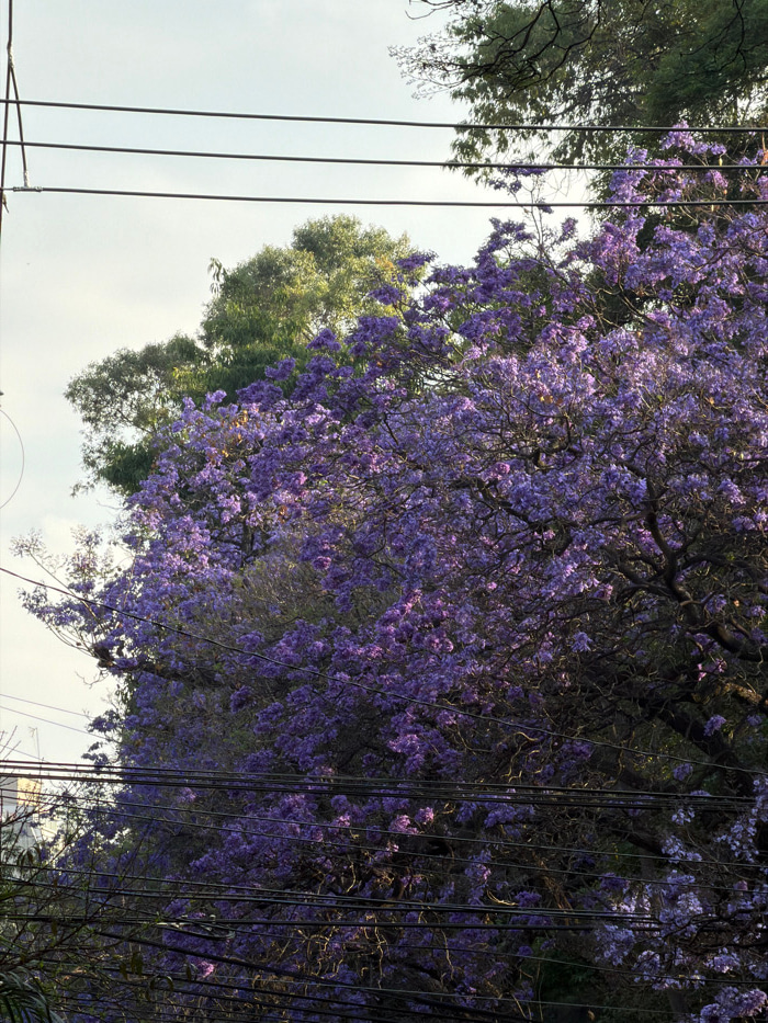 The image presents an upward view of a dense Jacaranda tree in full bloom, heavily laden with purple flowers, occupying the majority of the frame. Behind and partially above the flowering tree, the ca…read more