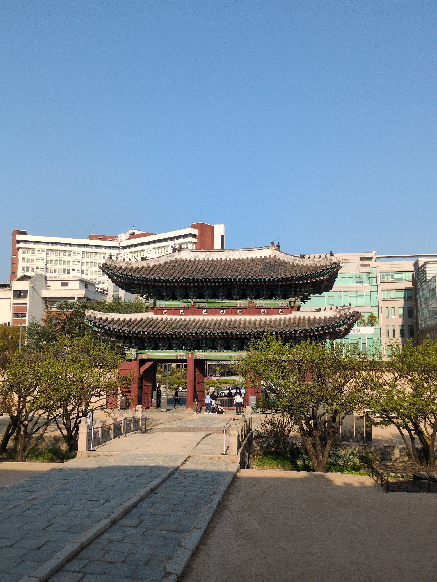 The image shows a traditional Korean gate or palace building in Seoul, South Korea, viewed from a slightly elevated perspective. The gate has an ornate, multi-layered tiled roof with a distinctive cur…read more