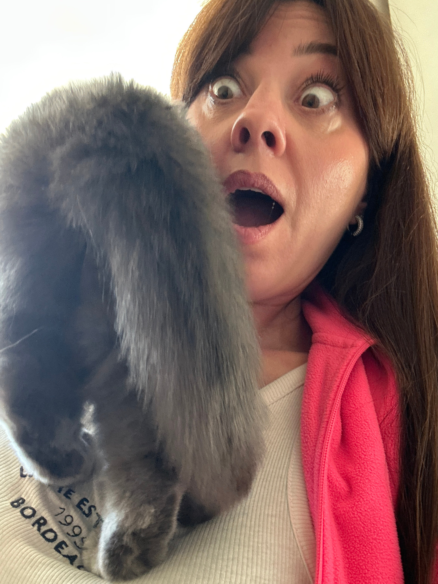 The image shows a woman and a cat. The woman has brown hair and is wearing a white tank top with black text that appears to read "E EST 1995 BORDEAU," and a pink fleece jacket. Her eyes are wide and m…read more