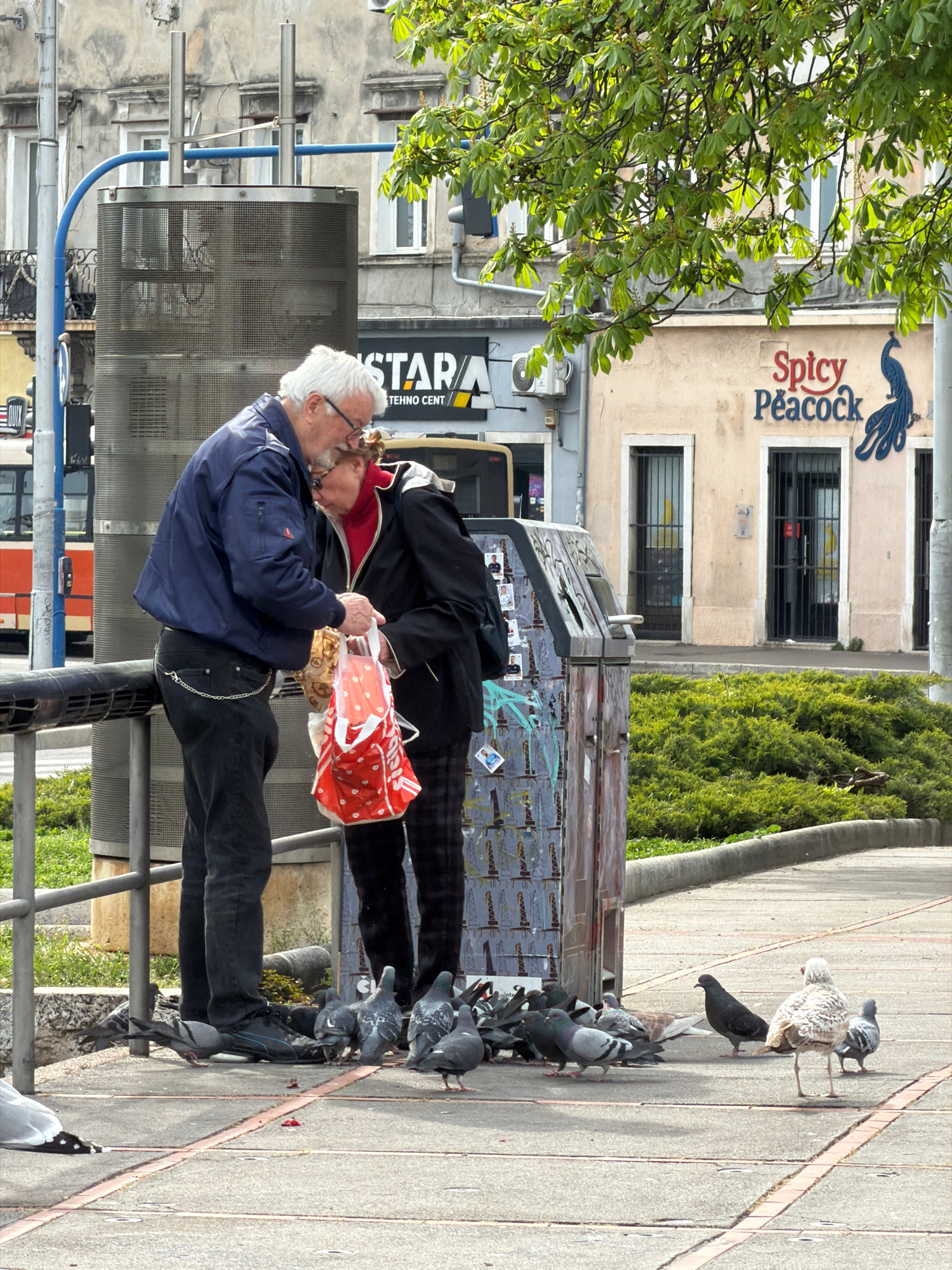 An eye-level full outdoor shot shows an elderly couple feeding pigeons from a red and white plastic bag on a city sidewalk in Grad Rijeka, Croatia. The man is wearing a blue jacket and black pants wit…read more