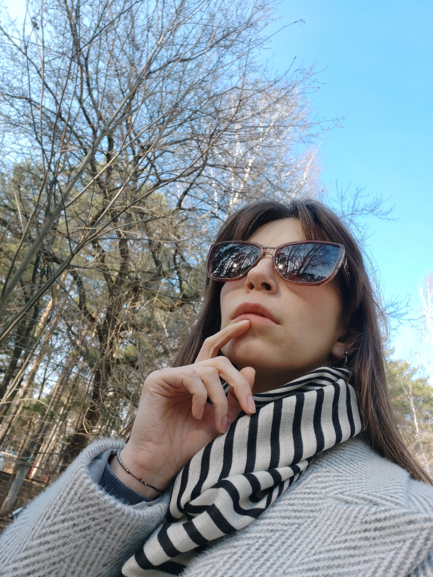 A young woman wearing sunglasses, a gray and white coat, and a black and white striped scarf is posing for a selfie. She is outside, with trees and a bright blue sky in the background. The location is…read more