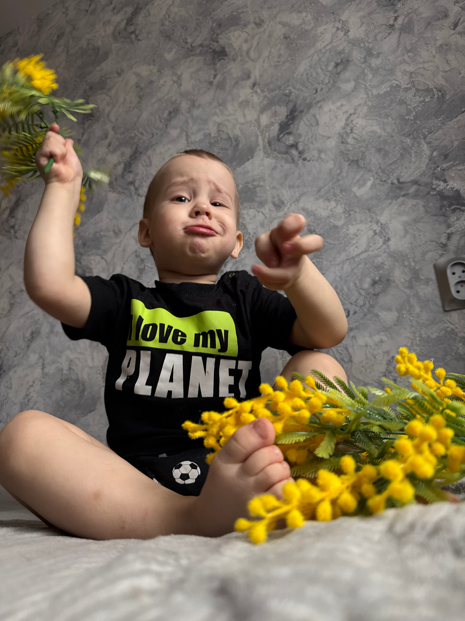 A young child is sitting on a bed in a room with grey marble-patterned walls, possibly in Rusanovo, Russia. The child is wearing a black shirt with the phrase "Love my PLANET" in green and white letteβ¦read more