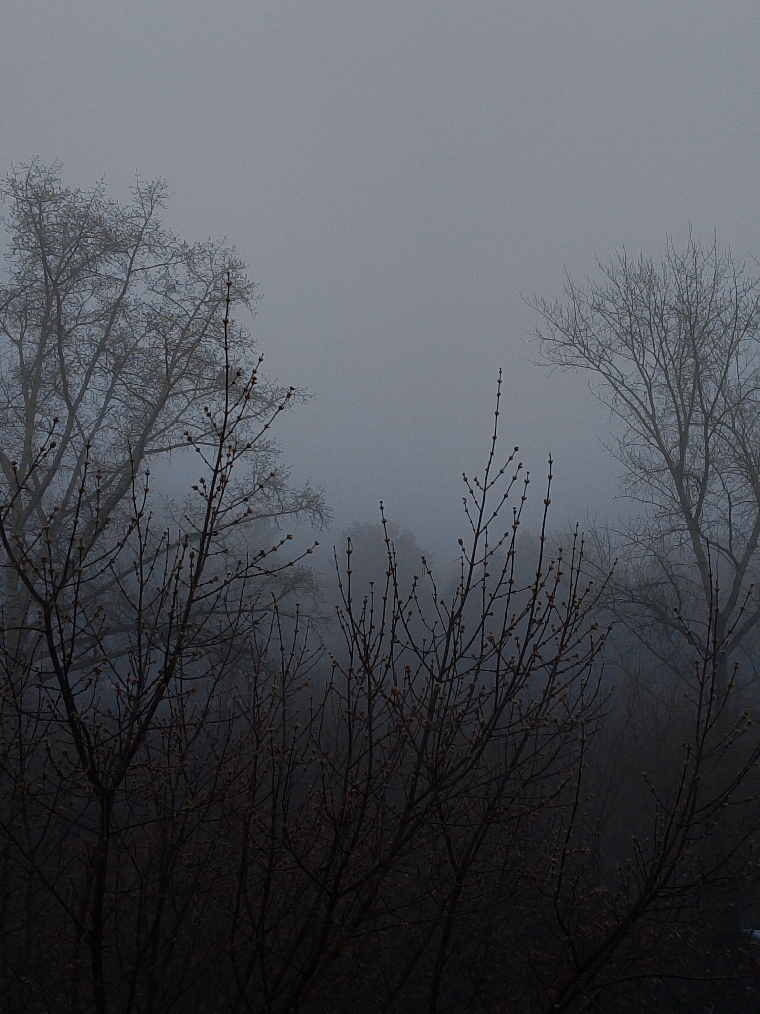 The image shows a dense fog enveloping a wooded area, likely on the outskirts of Izhevsk, Russia, given its northern climate. The trees are bare, with only nascent buds visible on the branches, indica…read more