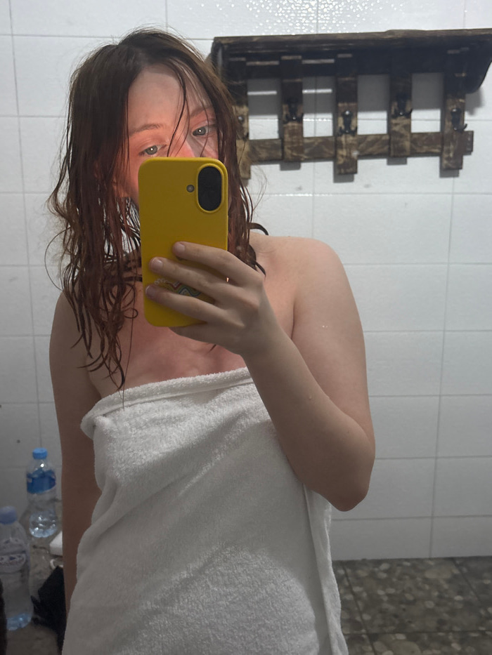 The image displays a mirror selfie of an individual, appearing female, in an indoor tiled room. The individual has long, wet, reddish-brown hair and is wrapped in a white terry cloth towel, covering h…read more