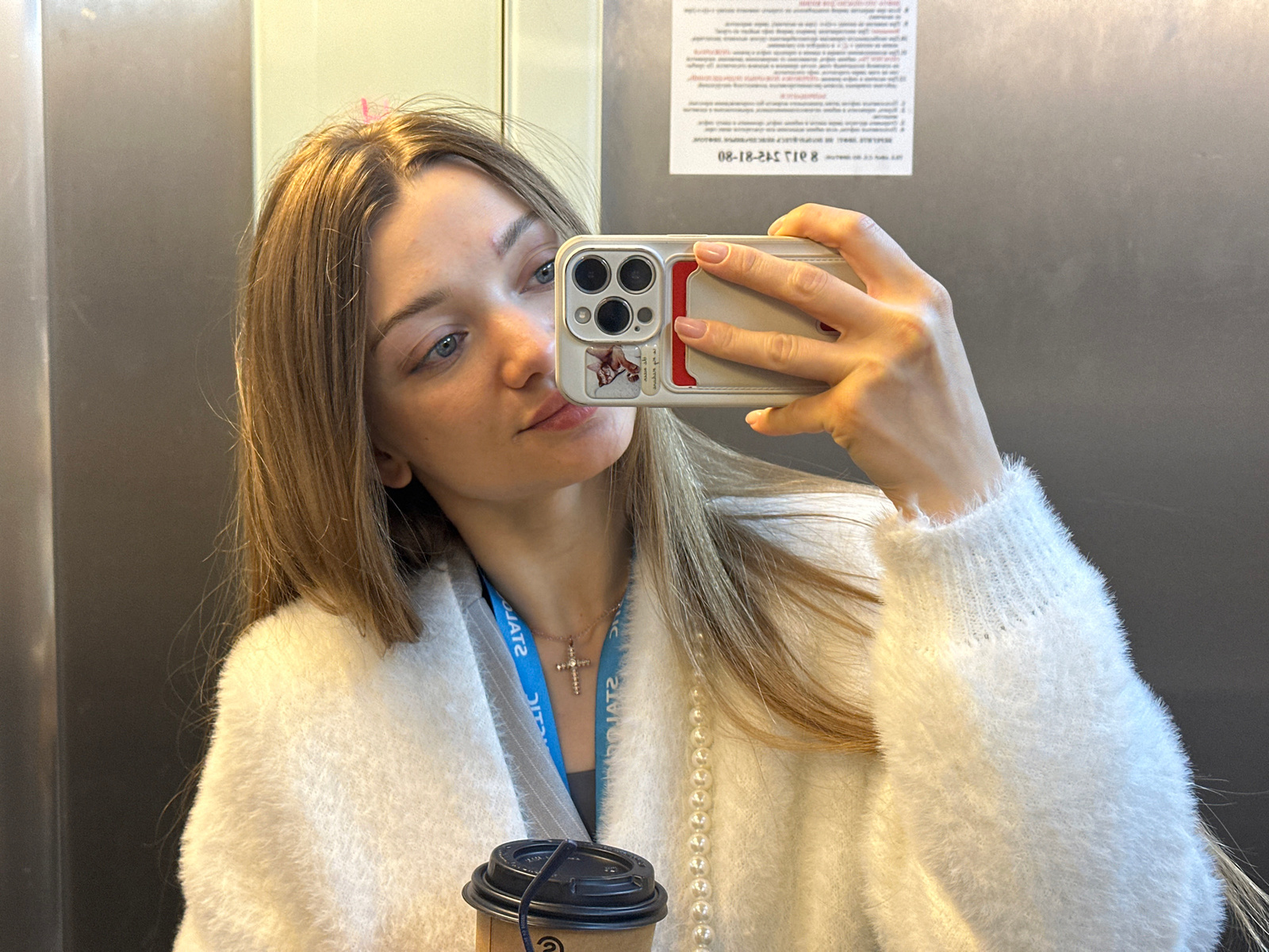 A young woman is taking a selfie in what appears to be an elevator. She is holding an iPhone in her right hand, and the phone's case has a picture of a cat on it. The woman has blonde hair, blue eyes,…read more