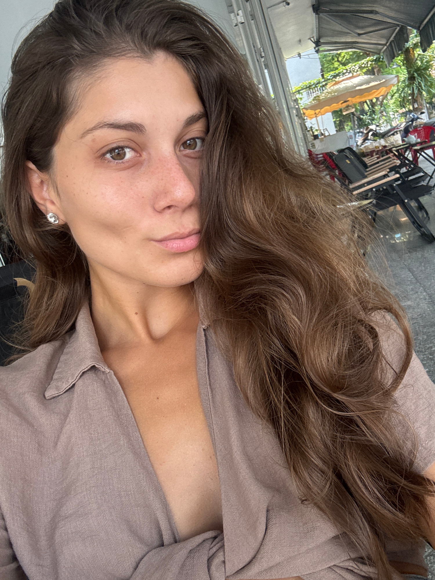 A selfie shot from a slightly low angle, the woman's face is the focal point. She has brown hair, brown eyes, and fair skin with freckles. She's wearing a neutral-colored blouse, and a stud earring is…read more