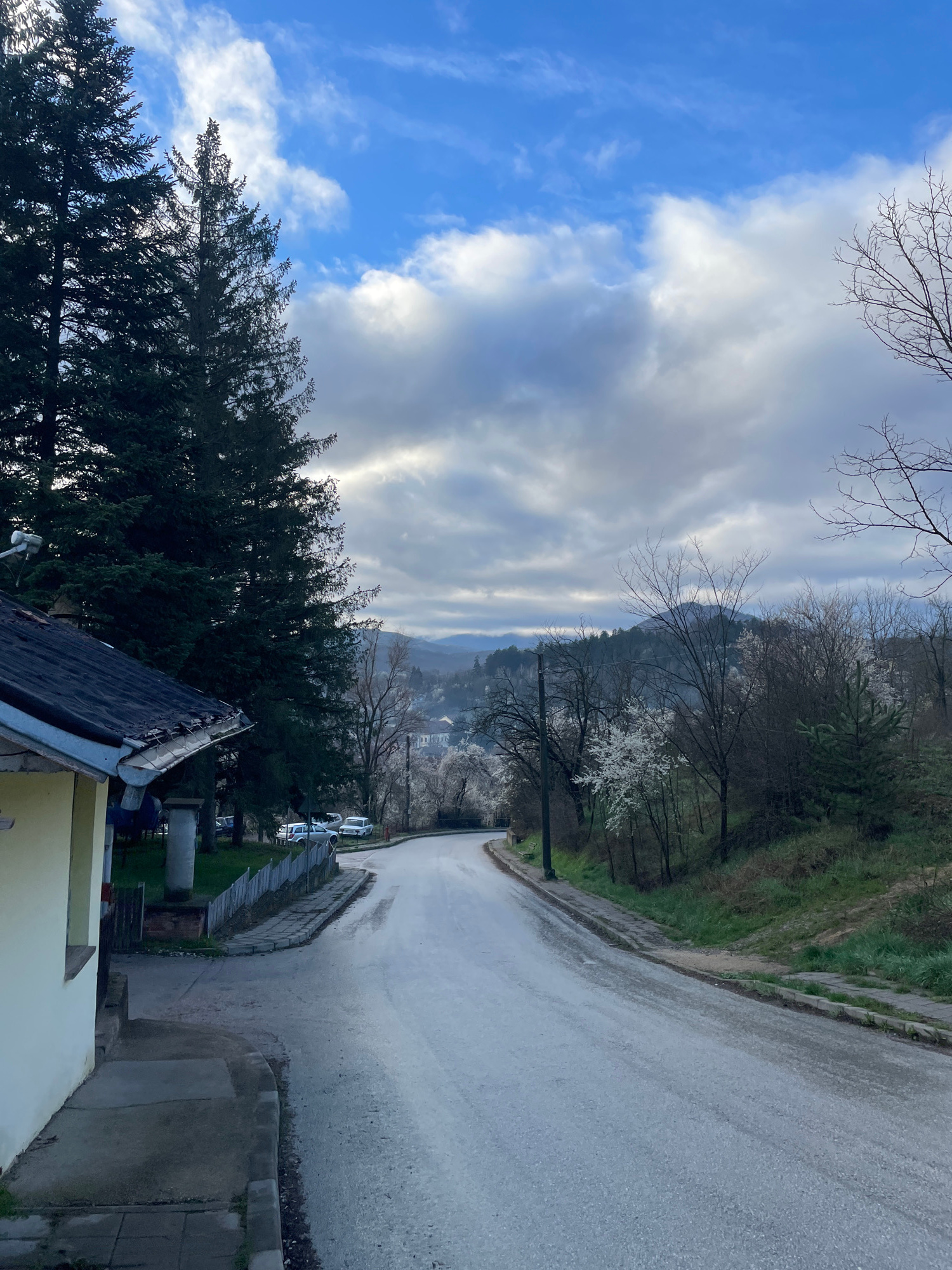 The image shows a view of a street in Elena, Bulgaria, with a mix of blue sky and clouds overhead. A road slopes downward from right to left, with a concrete curb and grassy bank on the right and tree…read more