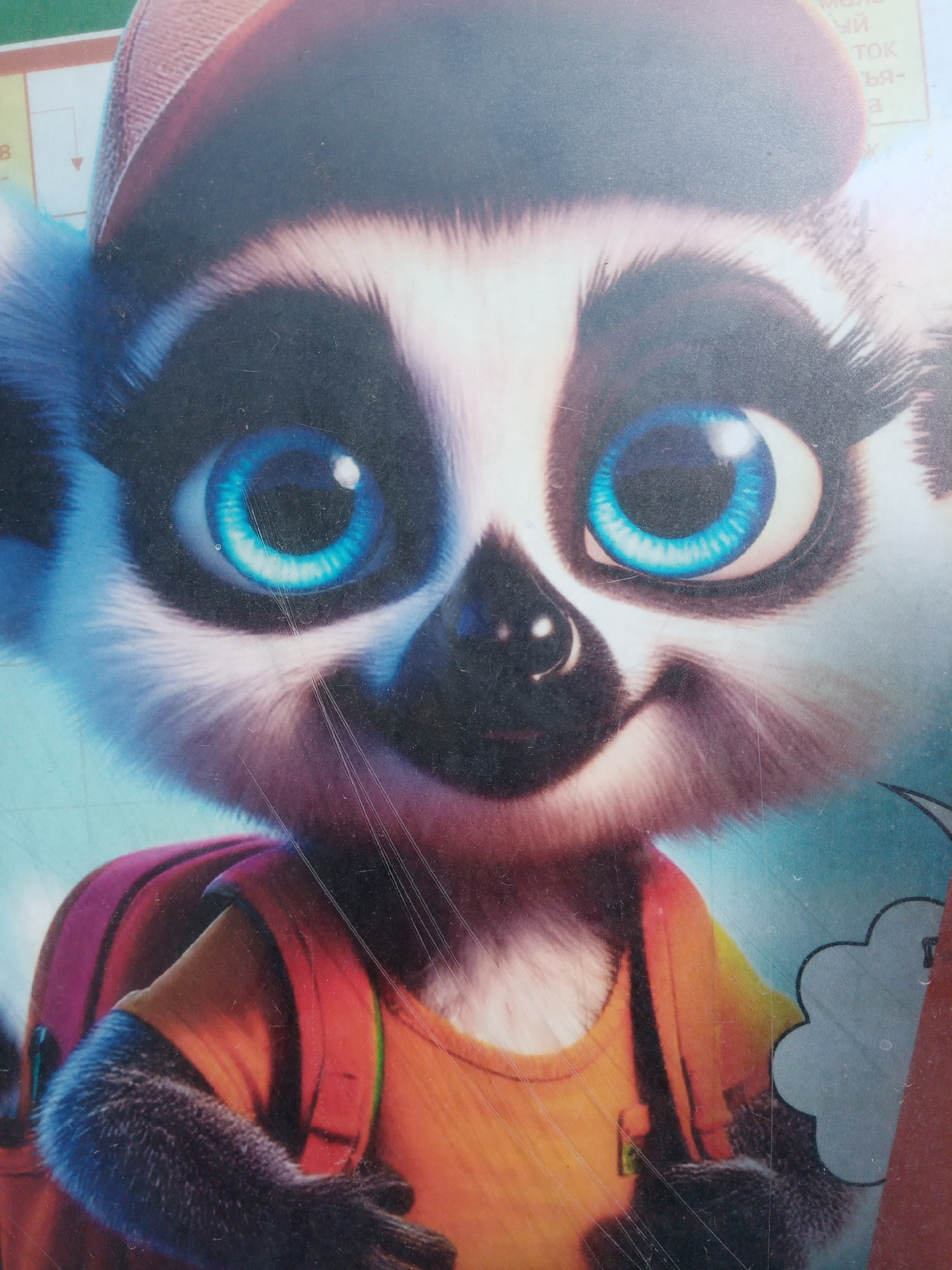 The image depicts a cartoon lemur wearing a backwards baseball cap and a backpack. The lemur has large, blue eyes, a black nose, and white fur. It is wearing an orange shirt. The background is blurred…read more