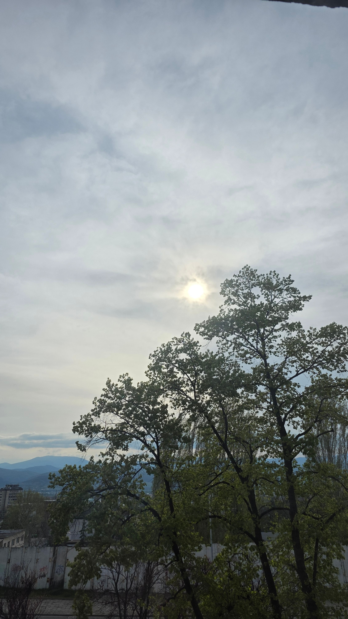 The image shows a daytime view in Blagoevgrad, Bulgaria, looking upwards towards a partially cloudy sky. The sun is visible, obscured by thin clouds. In the upper right, branches of trees with green l…read more