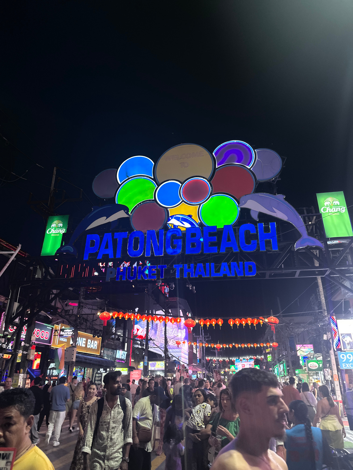 A nighttime, low-angle photograph captures a crowded street scene in Patong Beach, Phuket, Thailand. An illuminated archway dominates the upper third of the image, featuring the words "PATONG BEACH" i…read more