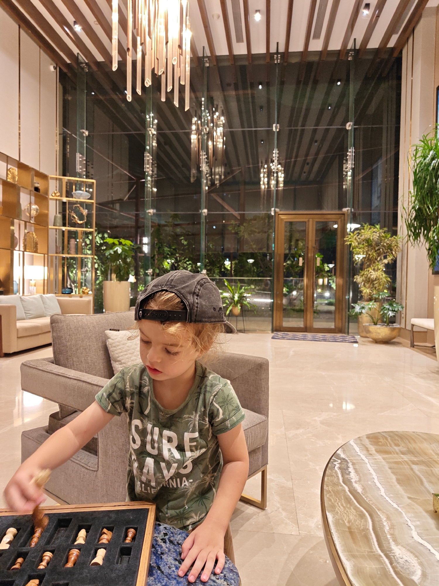 A young boy wearing a dark grey baseball cap and a green t-shirt is playing with chess pieces in a well-lit interior, presumably a hotel lobby. He is seated on a grey chair, placing a chess piece into…read more