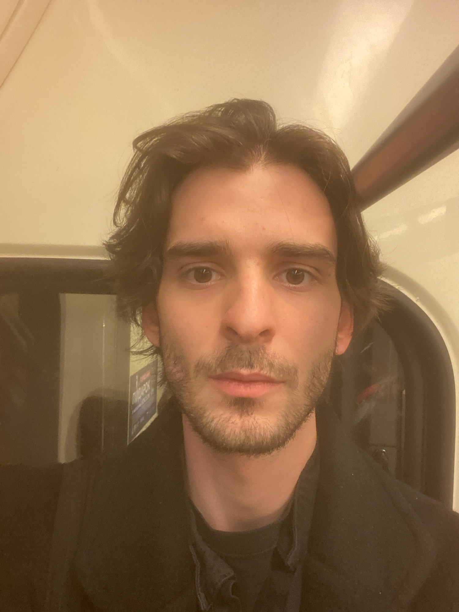 A young man is sitting inside a train, presumably a subway car. The train car appears to be fairly standard, with a long interior. The train seems to be in motion. The man has dark hair, stubble, and…read more