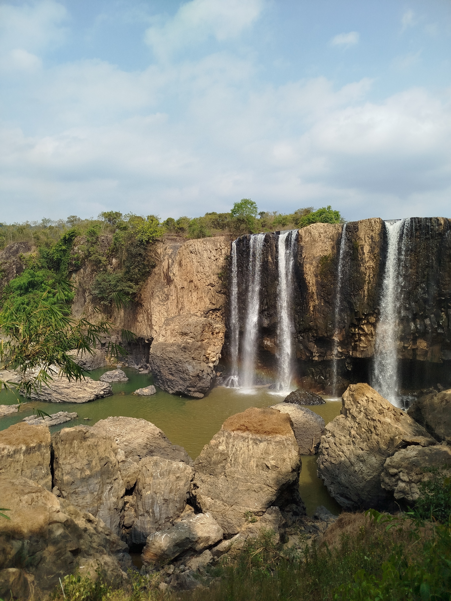 The image shows a waterfall cascading over a cliff into a pool of water. The location is identified as Đà Giang, Vietnam. A rainbow is visible at the base of the waterfall. The surrounding terrain inc…read more