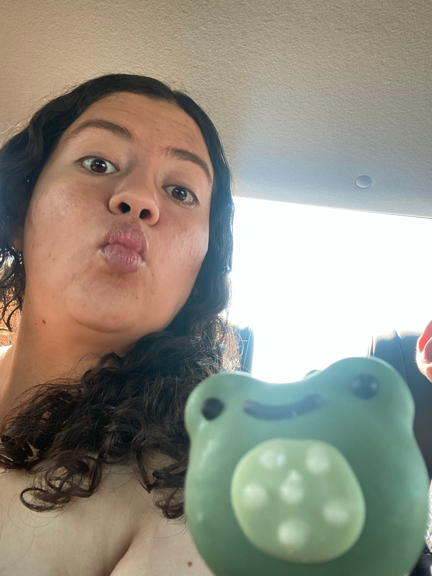 A selfie-style photo appears to be taken inside a car. A woman with curly dark hair and light skin is in the foreground, making a kissing face towards the camera. A green frog-shaped object, possibly…read more