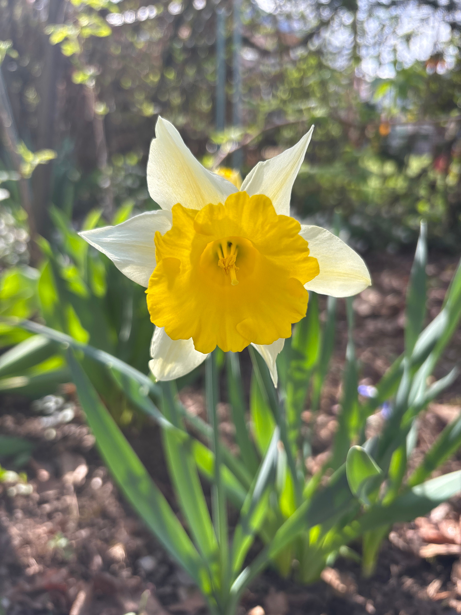 The image shows a daffodil flower in close-up view. The flower has white petals and a ruffled yellow trumpet. It is surrounded by green leaves. The background is blurry and shows glimpses of other pla…read more