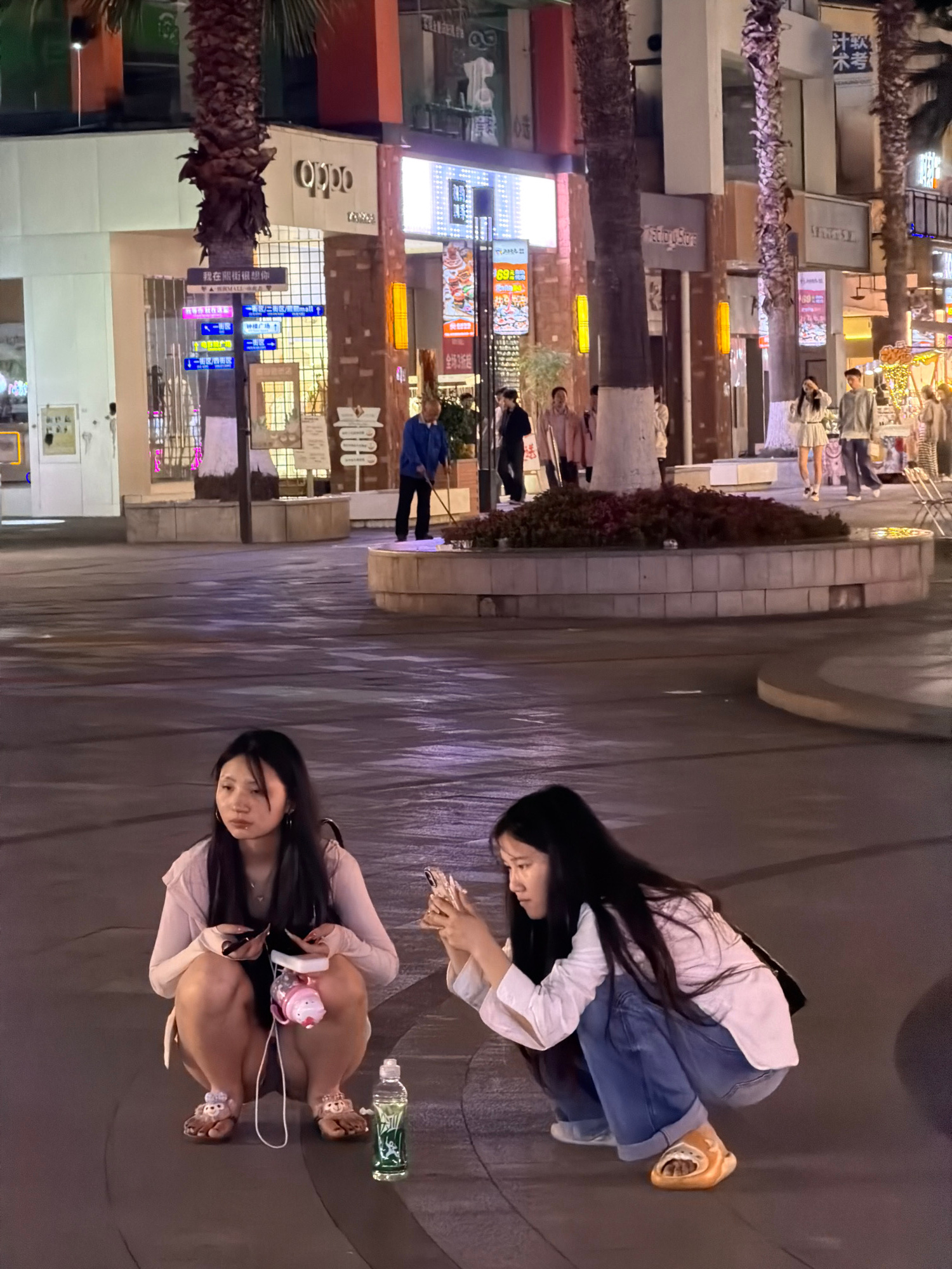 Here is a description of the image: The photo shows an outdoor scene at night, in what appears to be a commercial or retail area. Two young women are sitting or kneeling on the ground. One is wearing…read more