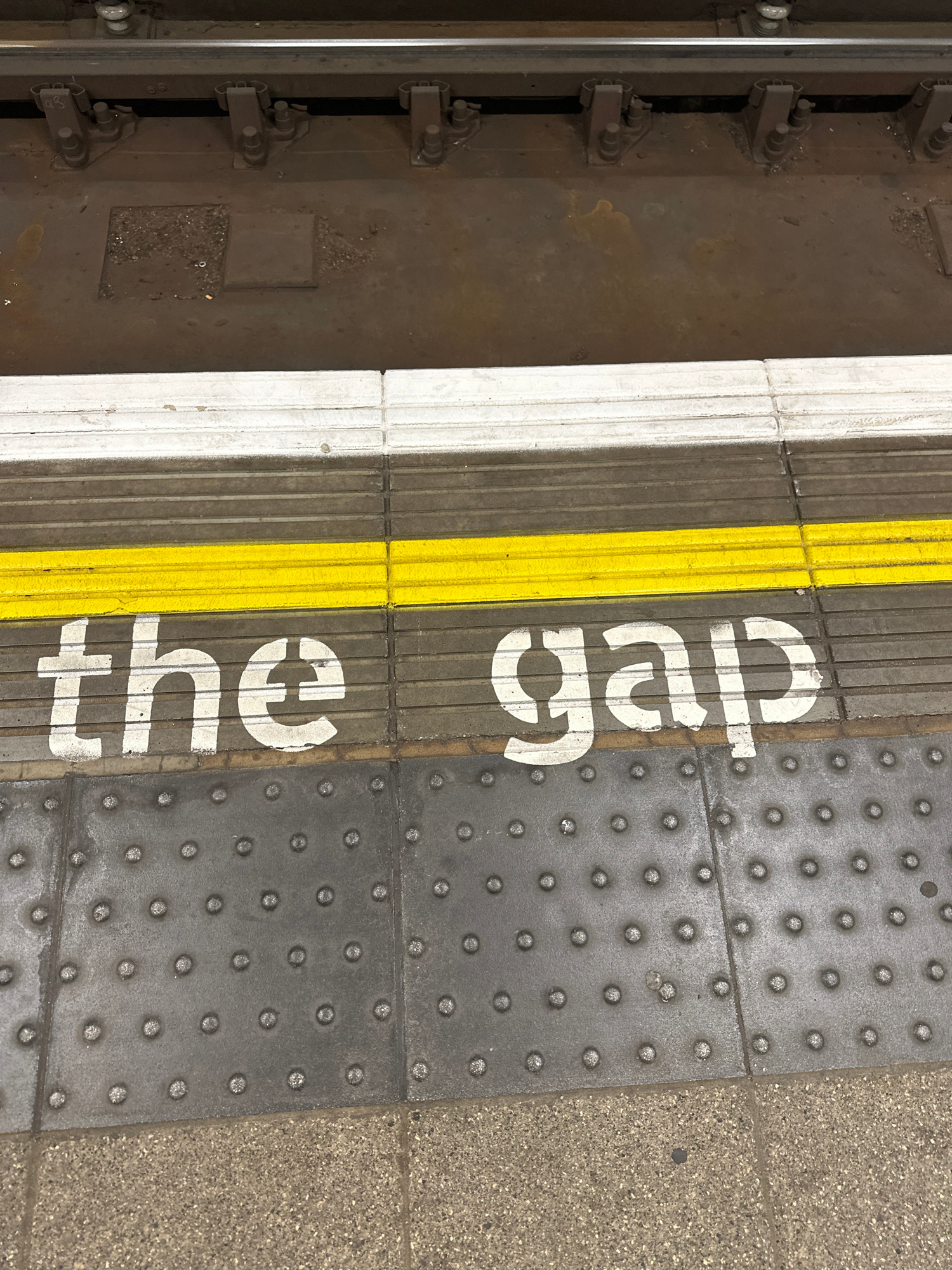The image captures a close-up, downward-angled view of a train station platform edge, strongly suggesting a London Underground or National Rail station. On the far left, a section of a dark metal rail…read more