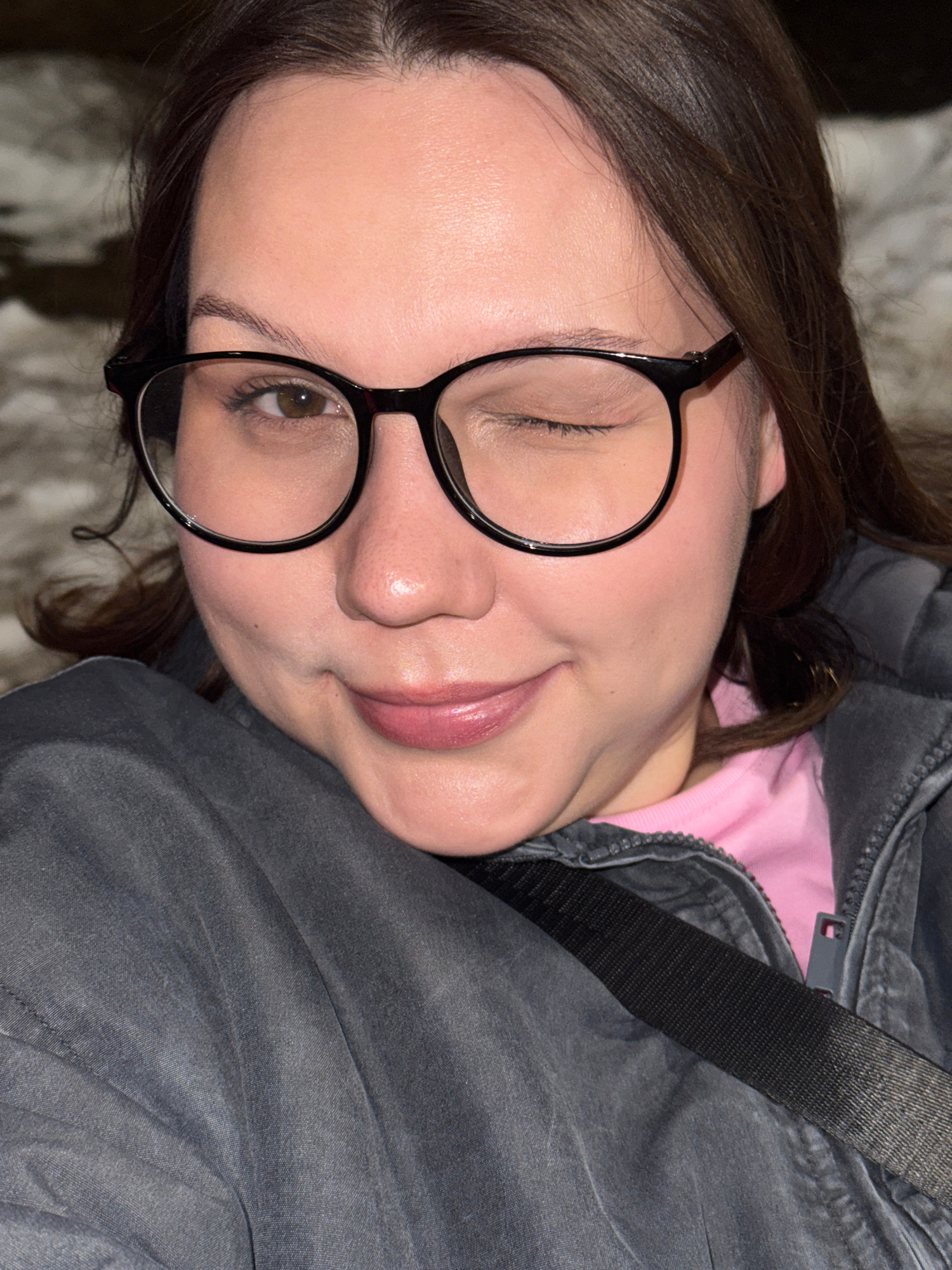 A woman with brown hair and light skin is wearing black-rimmed glasses. She is partially reclined, wearing a pink top underneath a zippered gray jacket. A black strap crosses over the jacket. The back…read more