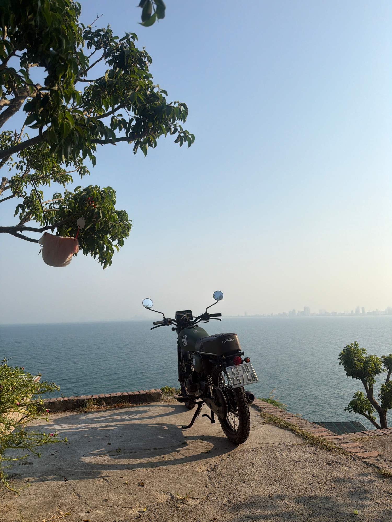 A motorcycle is parked on a concrete path next to a body of water. The motorcycle is facing away from the viewer, and its license plate is visible, reading "43-AB1 257.48". The motorcycle has a brown…read more