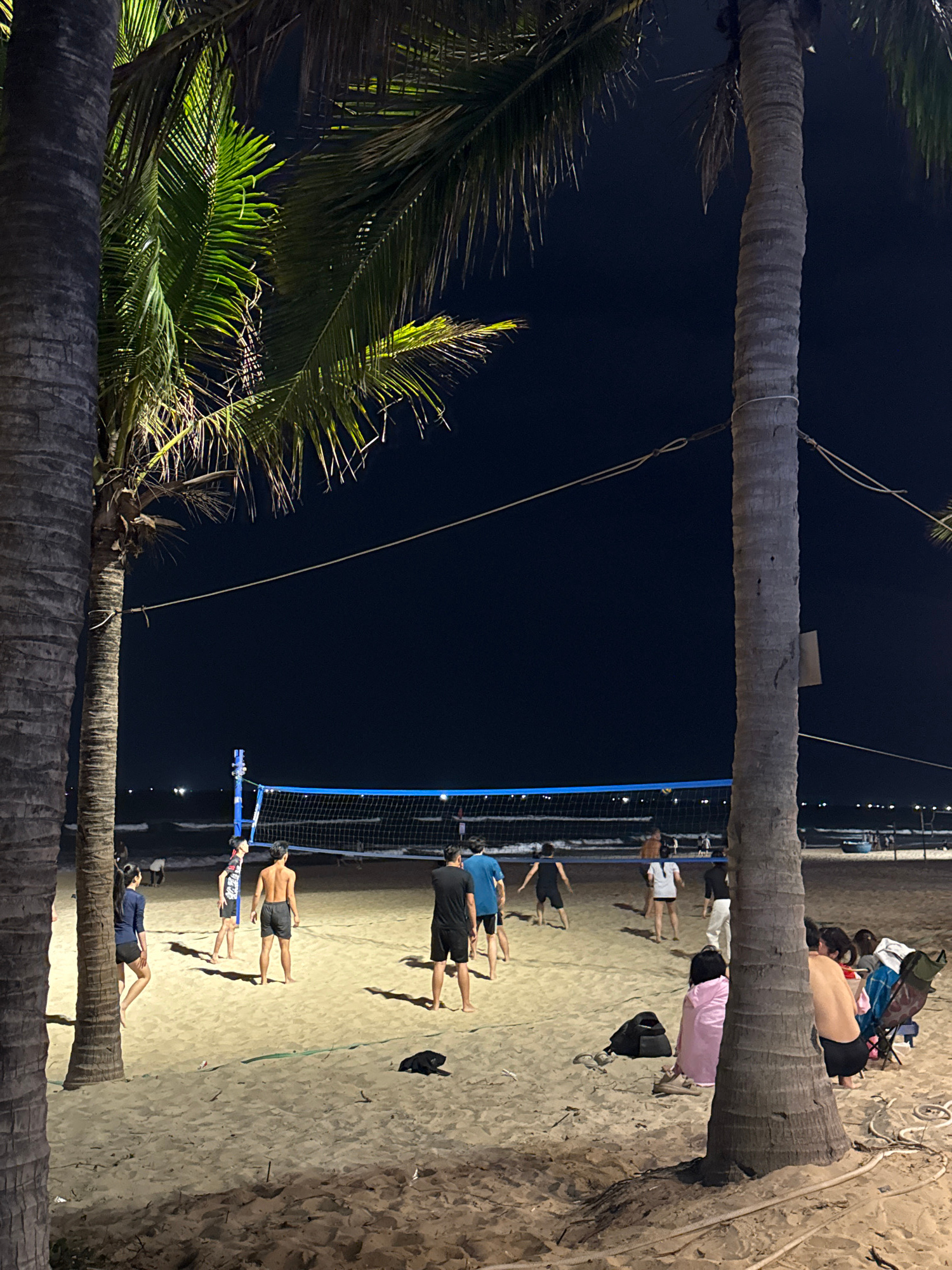 The image captures a vibrant night scene on a beach in Đà Nẵng, Vietnam. Thick palm tree trunks frame the left and right sides of the photograph, their textured barks prominent. Lush green palm fronds…read more