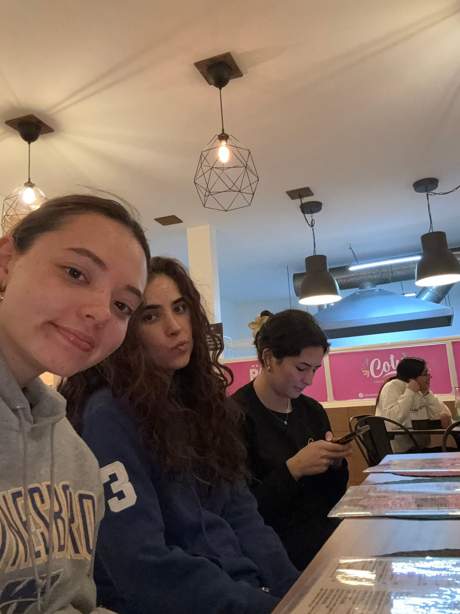 The image shows three women at a table in a restaurant in Atlixco, Mexico. One woman takes a selfie. Another woman is looking at the camera. The third is using a smartphone.