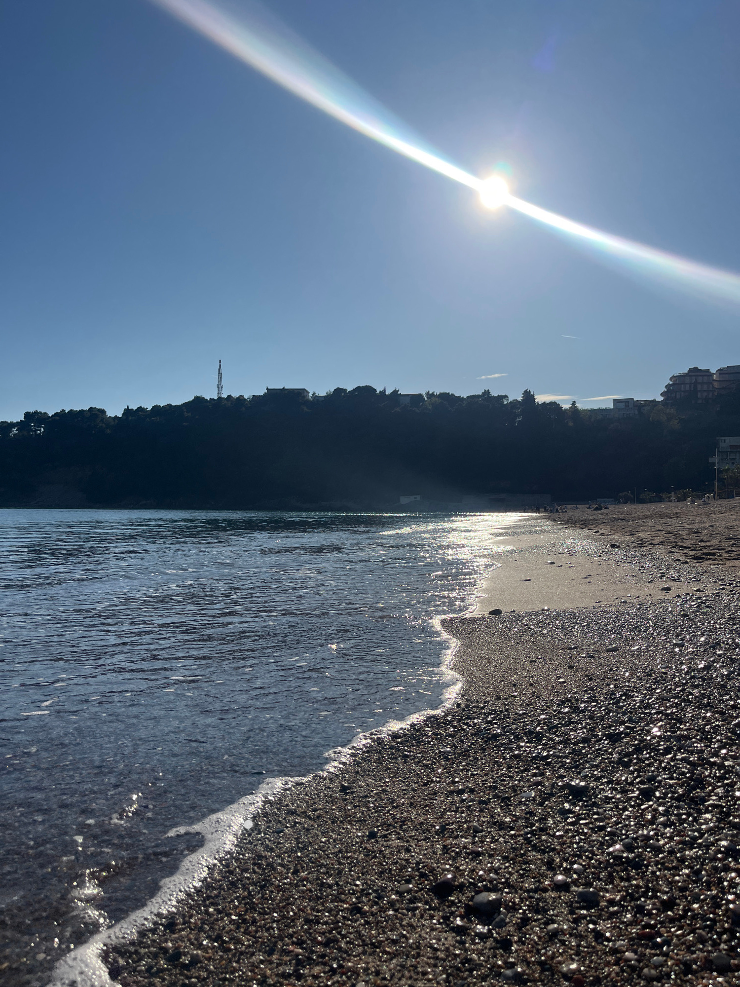 The image depicts a beach scene in Boreti, Montenegro. The sun is high in the sky, causing a bright glare and a long light streak. To the right, the shoreline is visible, composed of dark, pebble-likeβ¦read more