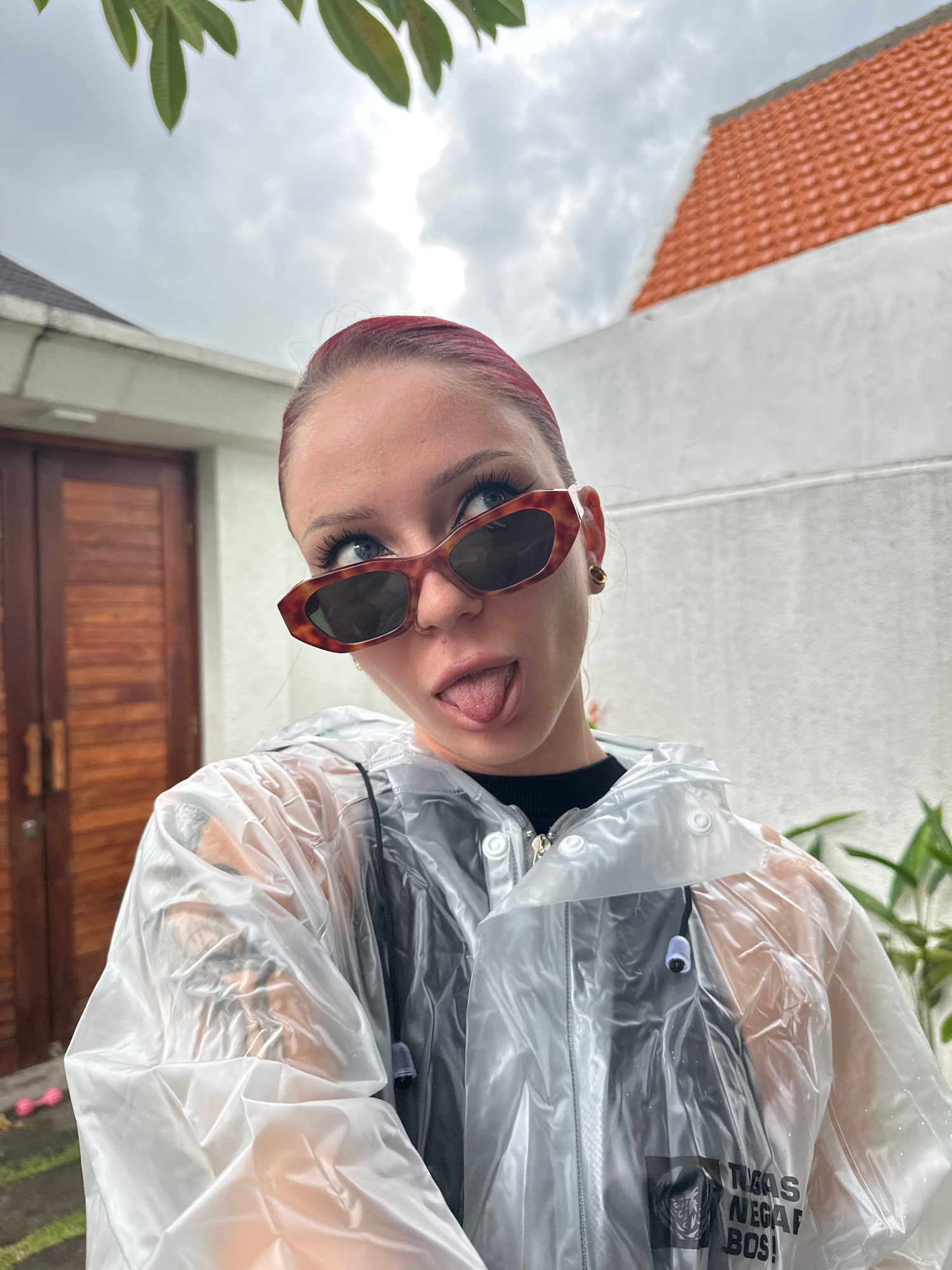A close-up, rotated portrait captures a young individual with reddish-brown hair, playfully sticking their tongue out. They are wearing large tortoiseshell-patterned sunglasses and a clear plastic rai…read more