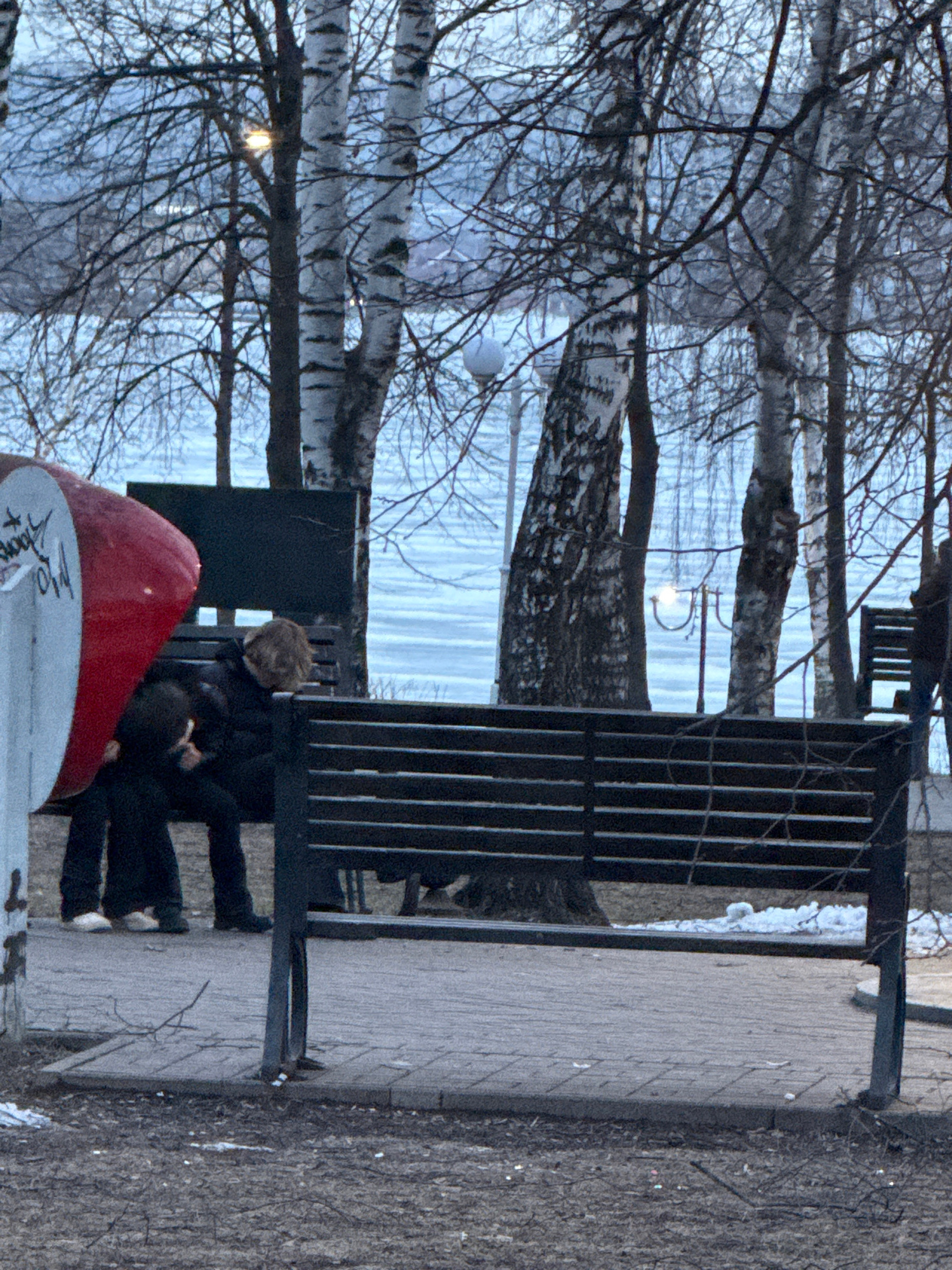 Two individuals are sitting on a park bench. The bench is located on a paved walkway, adjacent to birch trees and a body of water, possibly the Votkinsk Reservoir, in Votkinsk, Russia. One person is s…read more