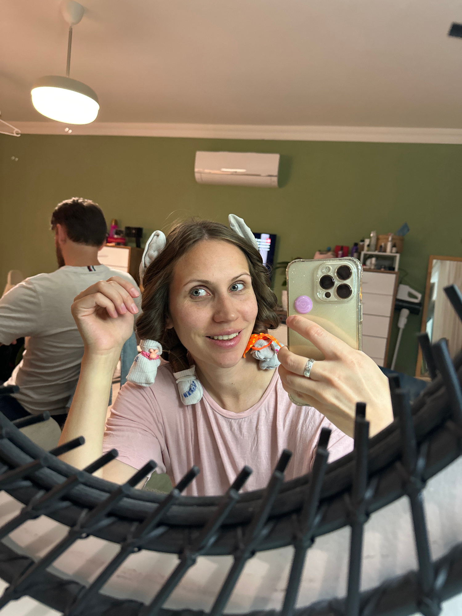 The photograph shows a woman taking a selfie in a room. She has brown hair, fair skin, and is wearing a light pink t-shirt. She has bunny ears on her head and is holding her phone up to take the pictu…read more