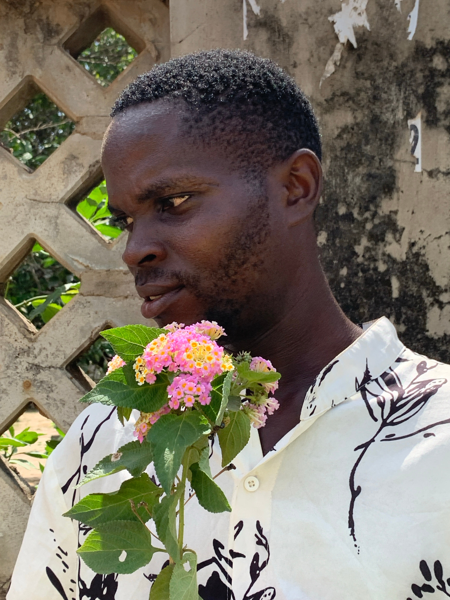 A man with dark skin and short hair, wearing a white shirt with a black floral pattern, holds a bouquet of pink and yellow flowers. He stands against a grey concrete wall with diamond-shaped openings,…read more