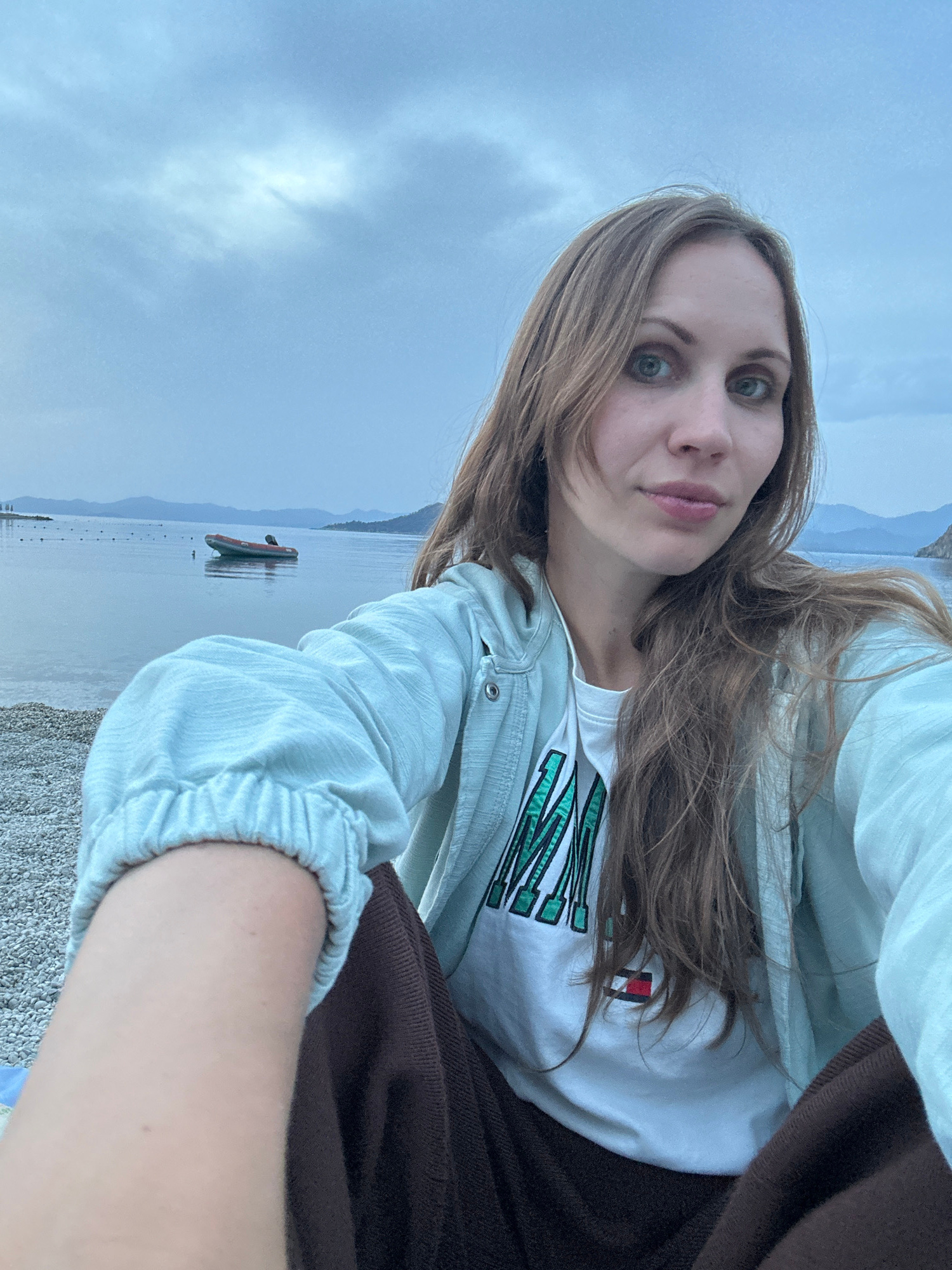 A young woman is featured in a low-angle, tilted selfie, looking directly into the camera with a neutral expression. Her long, light brown hair frames her face. She is wearing a light blue or mint-col…read more