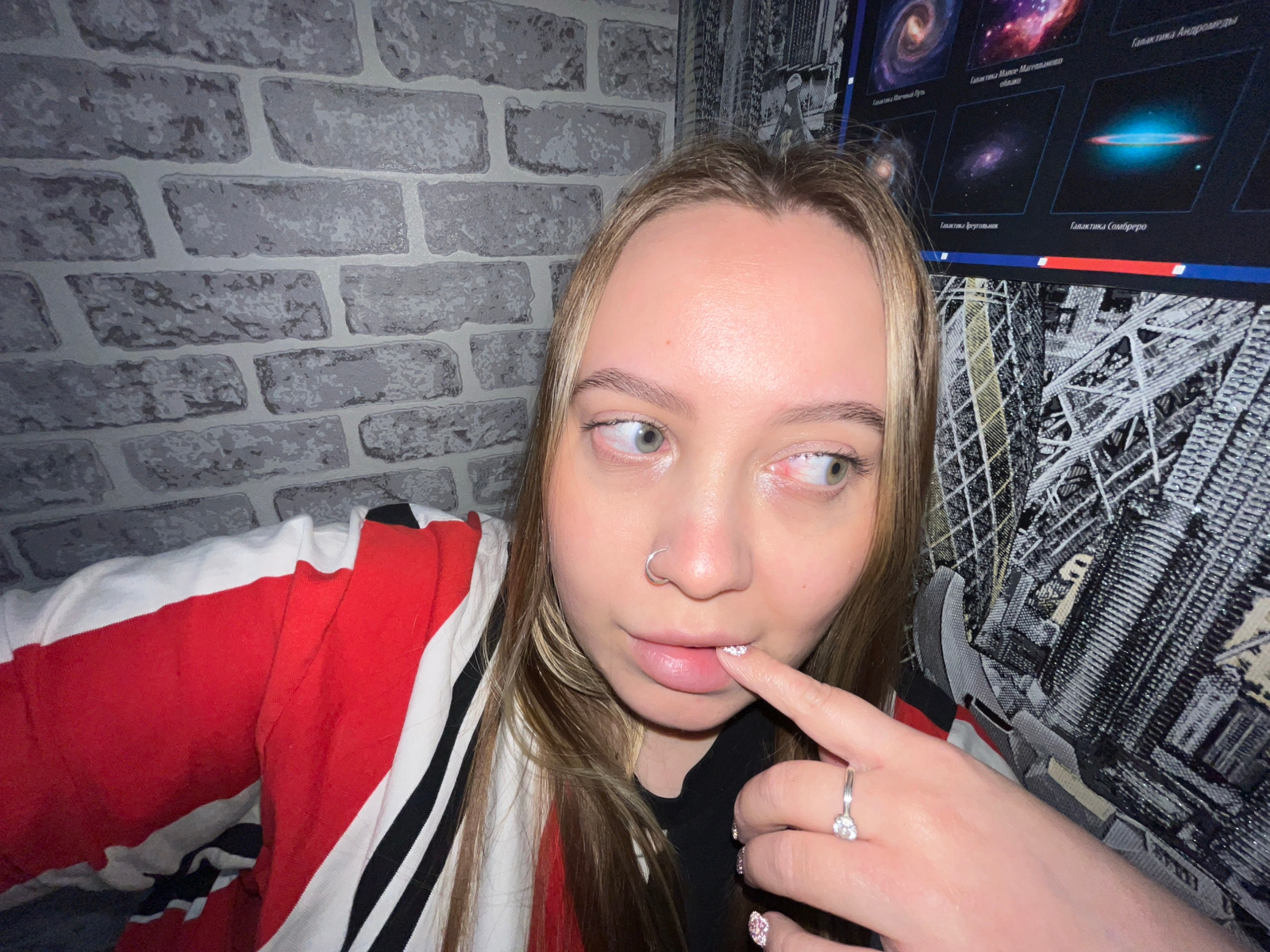 A young woman's face, inverted, is centered in the frame. Her left index finger, adorned with glittery pink nail polish and a ring, is touching her upper lip. She has a nose piercing and fair skin. Sh…read more