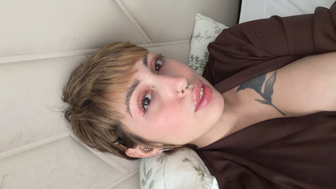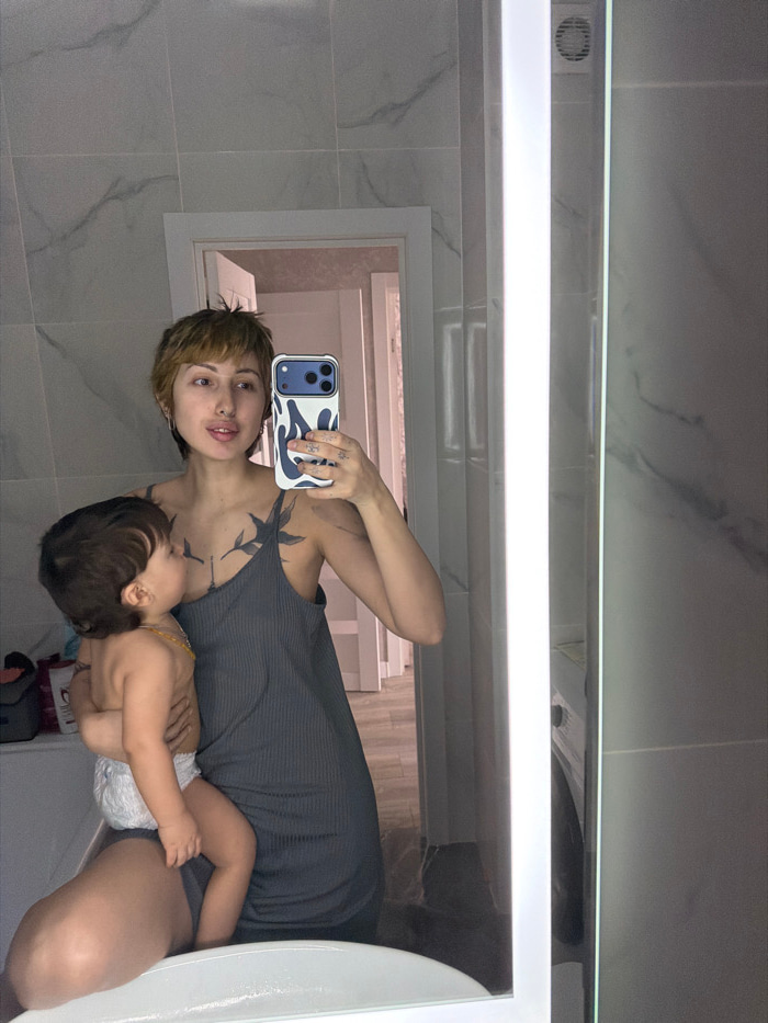 The scene depicts an adult female taking a mirror selfie in a residential bathroom, located in Bataysk, Russia. The female, with short, choppy, light brown hair and a septum piercing, wears a dark gre…read more