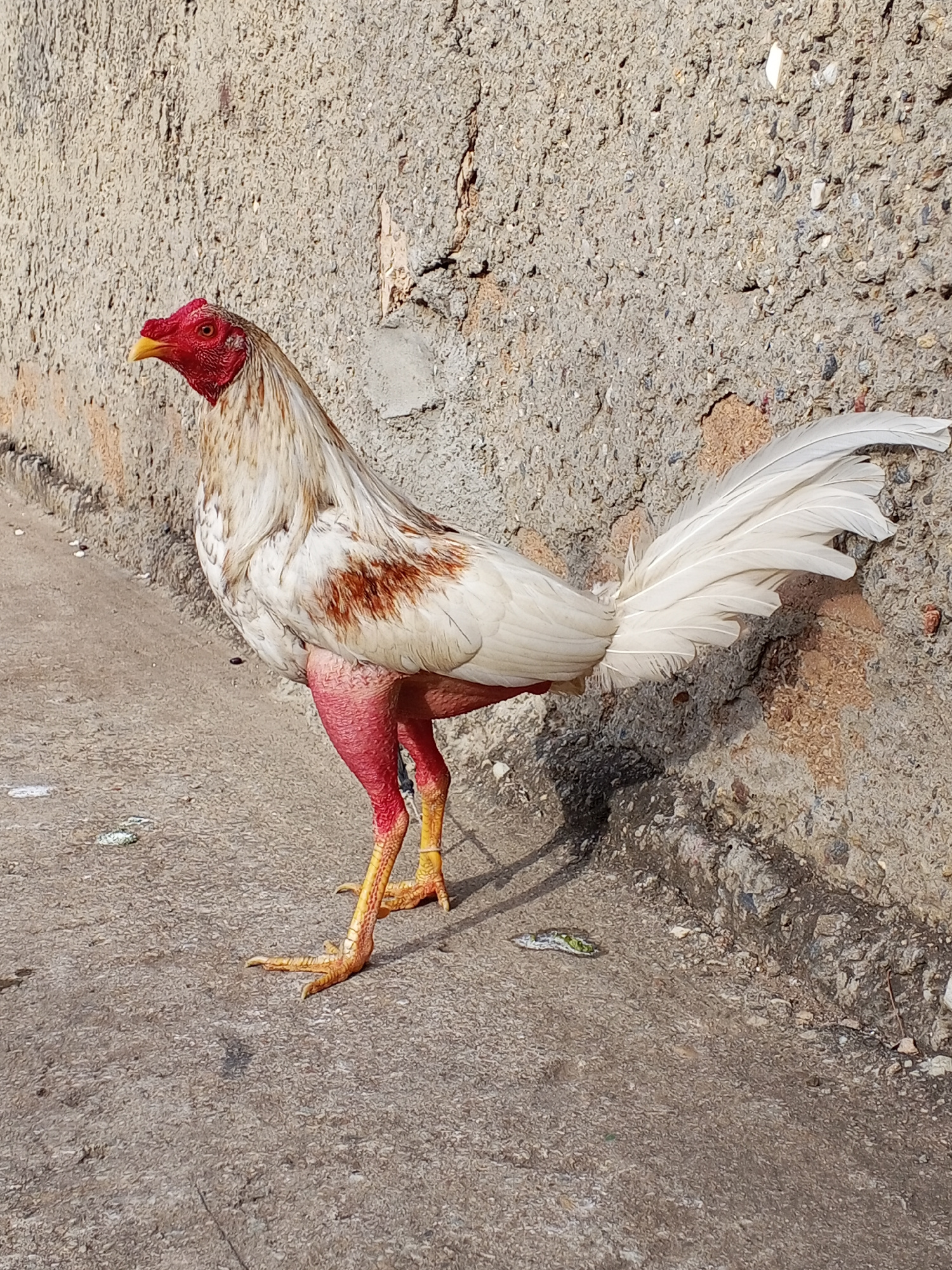 A white and brown rooster stands on a concrete surface against a textured concrete wall. The rooster has a red head and legs with yellow feet. There is debris on the ground near the rooster's feet. Thβ¦read more