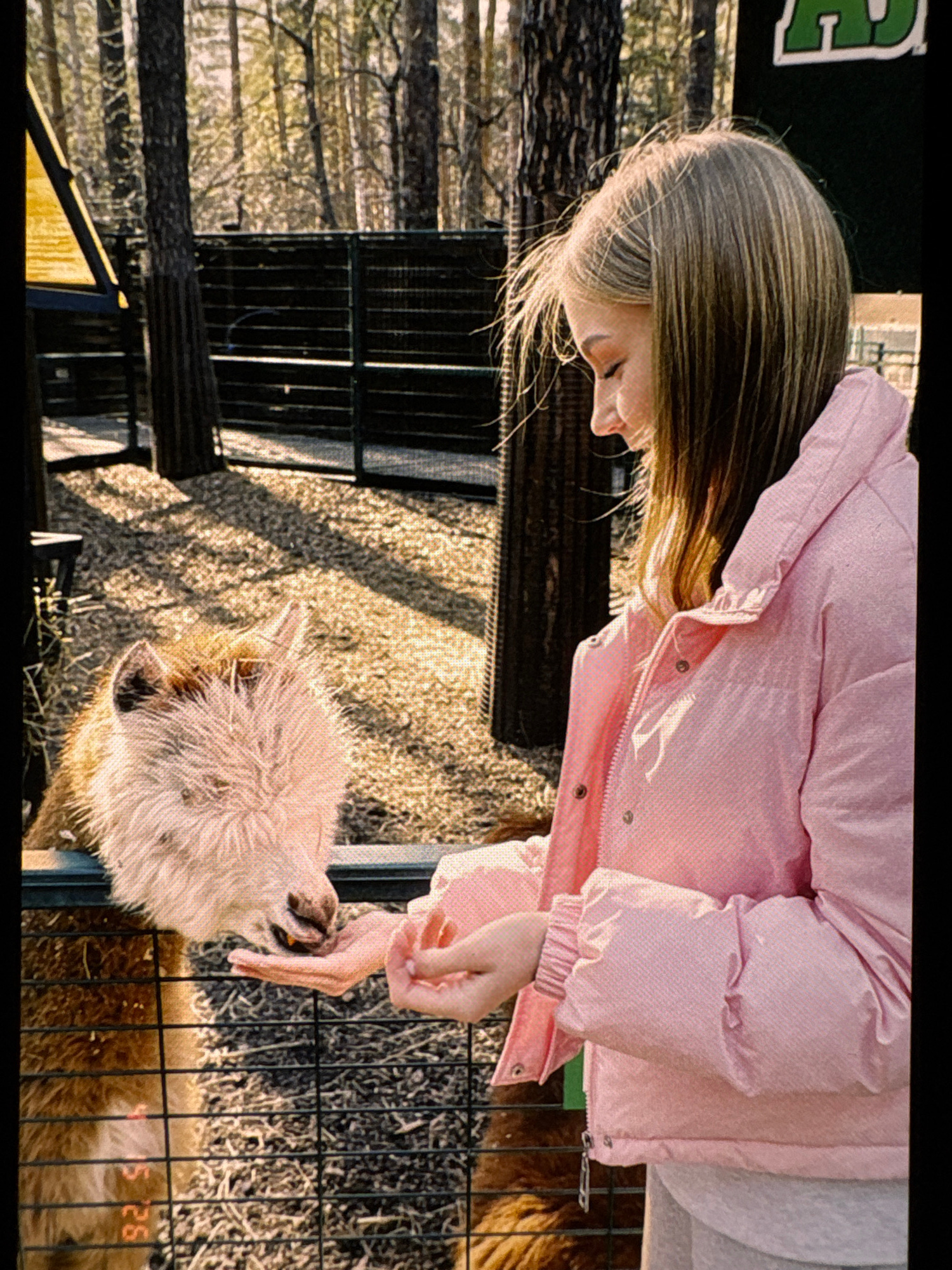 A photograph depicts a woman interacting with a llama through a metal fence. The woman is wearing a pink puffy jacket and light-colored pants. Her hair is blonde and streaked. The llama, with a light-…read more