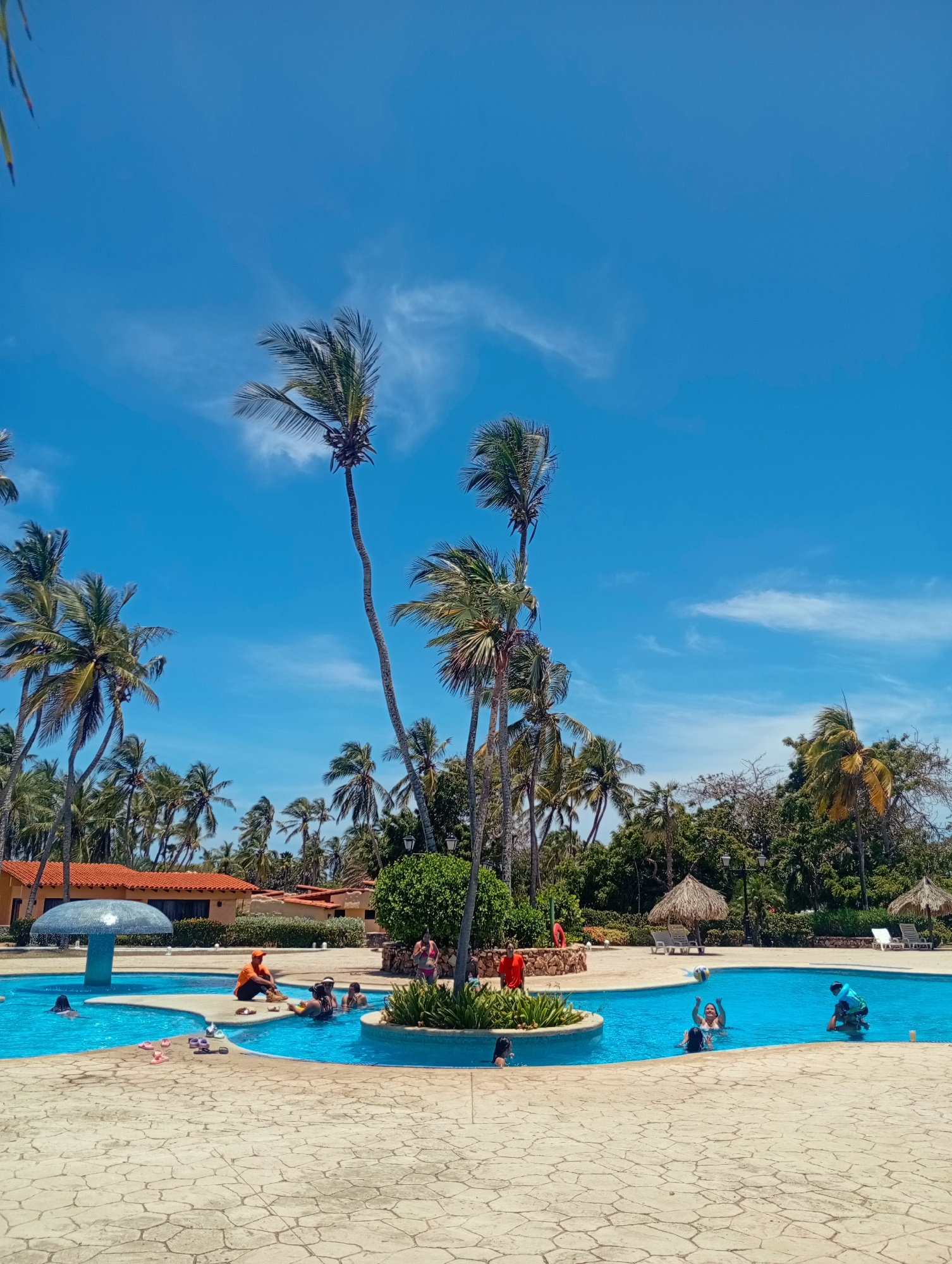 This image shows a swimming pool area at what appears to be a resort or hotel in Playa El Agua, Venezuela. The pool is segmented into interconnected sections, surrounded by a light-colored, patterned…read more