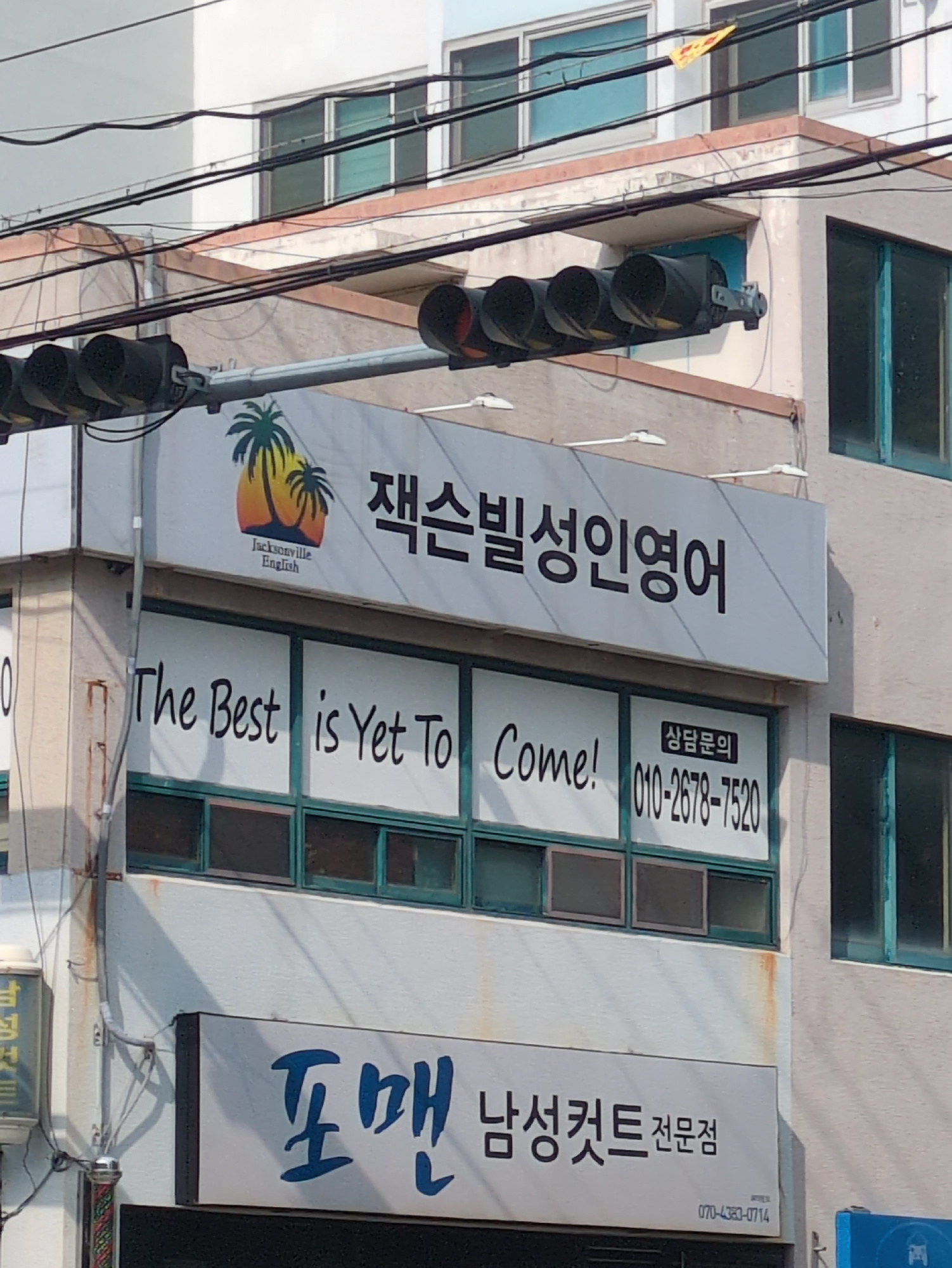 The image shows a street scene in Ulsan, South Korea. There are three vertically aligned business signs advertising services. The first advertises "Jacksonville English" in Korean and English, with a…read more