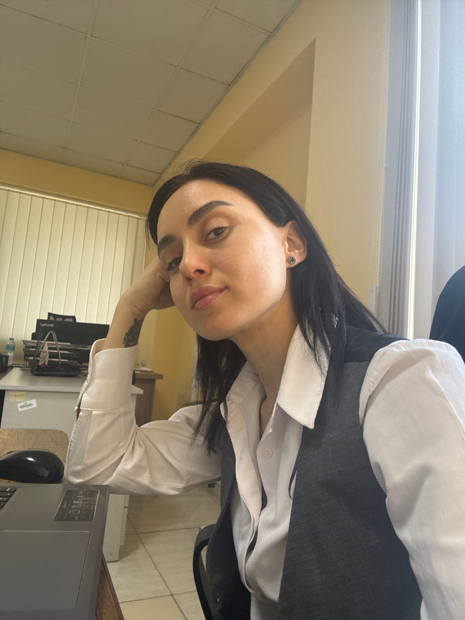 A young woman with dark hair is posing for a photograph indoors. She is wearing a white collared shirt with the sleeves rolled up, and a dark vest over it. She has an earring in her left ear and a tat…read more