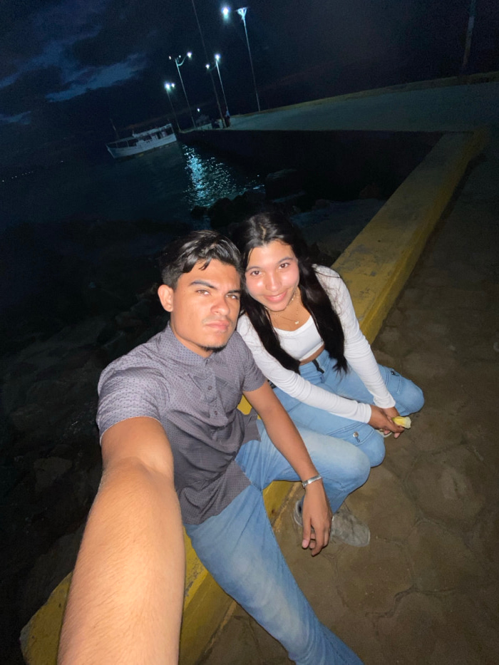 A young couple poses for a selfie at night near the water. The woman, wearing a white long-sleeved top and jeans, sits next to the man in a dark button-down shirt and jeans. They're positioned near a…read more