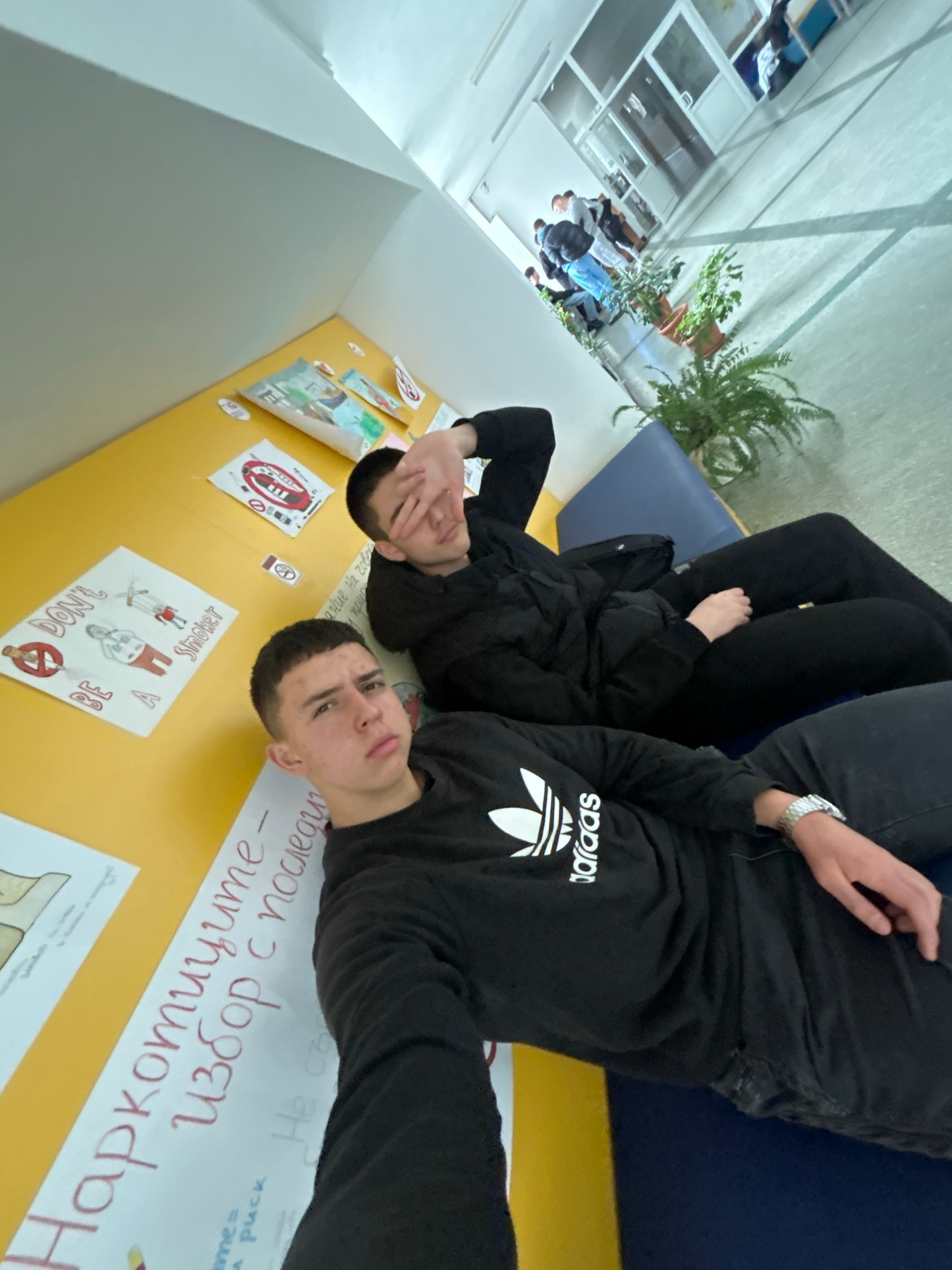 Two young men are lying on a yellow surface covered in posters, one wearing an Adidas sweatshirt. The posters appear to be public health messages related to smoking and narcotics. The location appears…read more