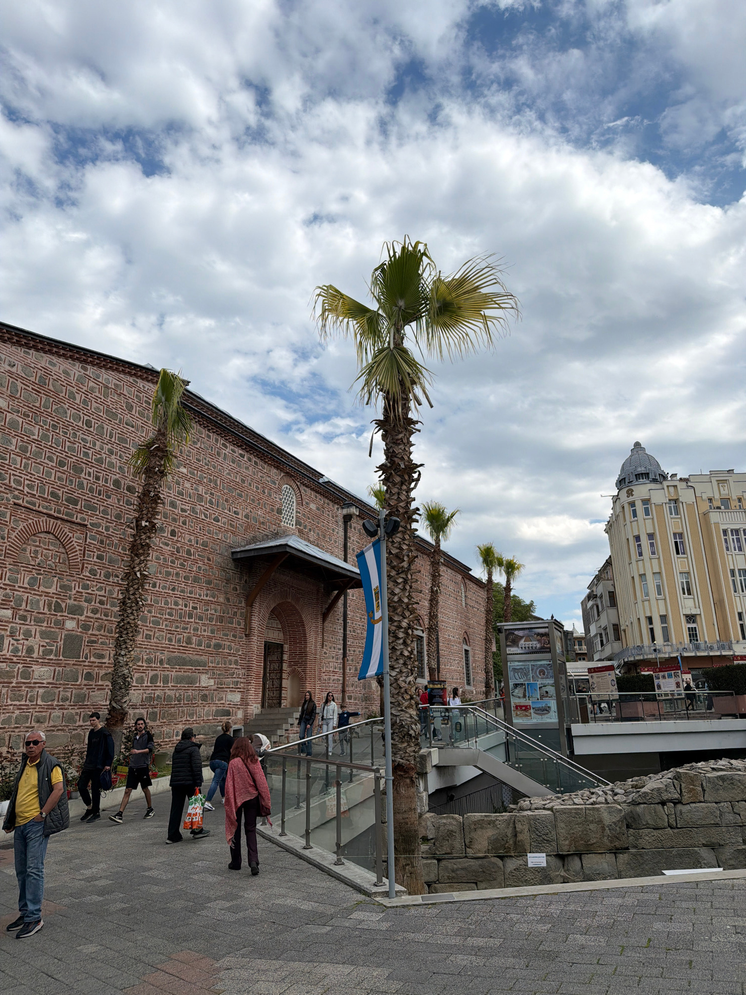 This daytime image captures a vibrant street scene in Plovdiv, Bulgaria, showcasing a blend of ancient, historic, and modern architectural elements under a partially cloudy sky. The foreground feature…read more