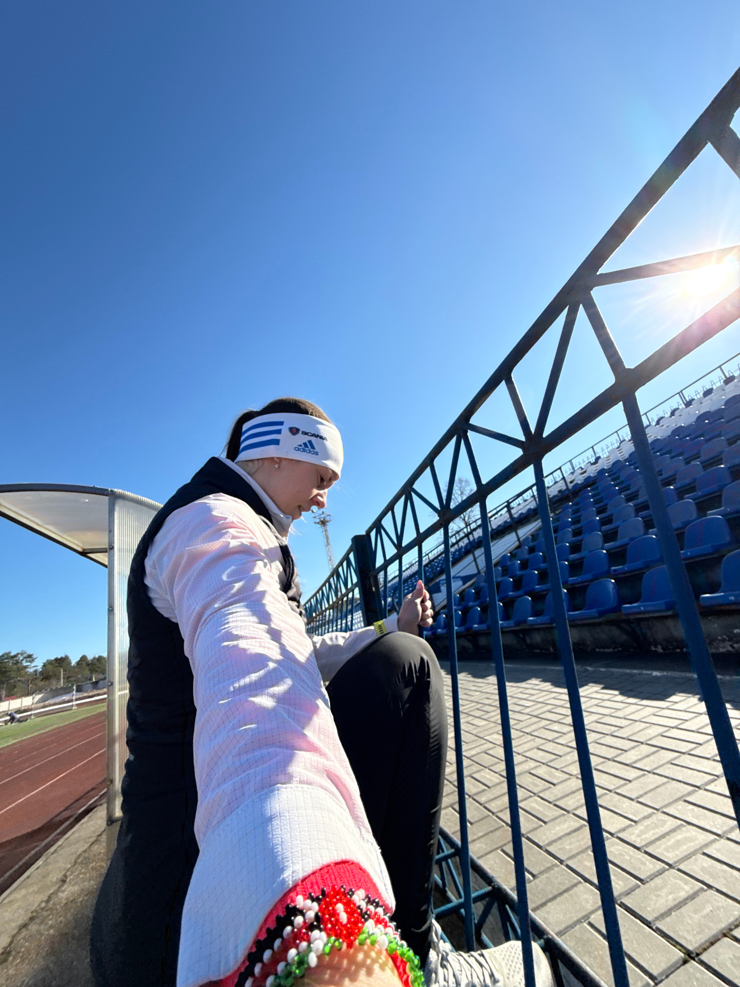 The image, taken in Chaikovsky, Russia, shows a person wearing a white Adidas headband with blue stripes, a white long-sleeve shirt, and black pants. The person is sitting in the bleachers of a stadiu…read more
