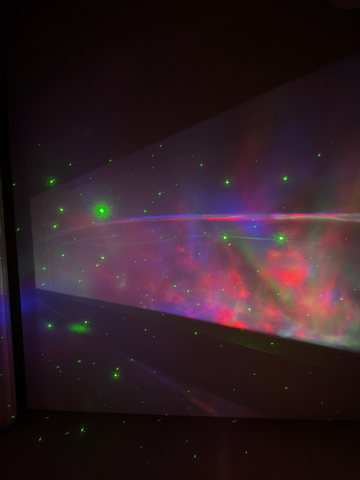 The image shows a dark room interior, likely a bedroom, with projections cast onto the ceiling and walls. The projections include diffuse patterns of red, blue, and green light, resembling a nebula or…read more