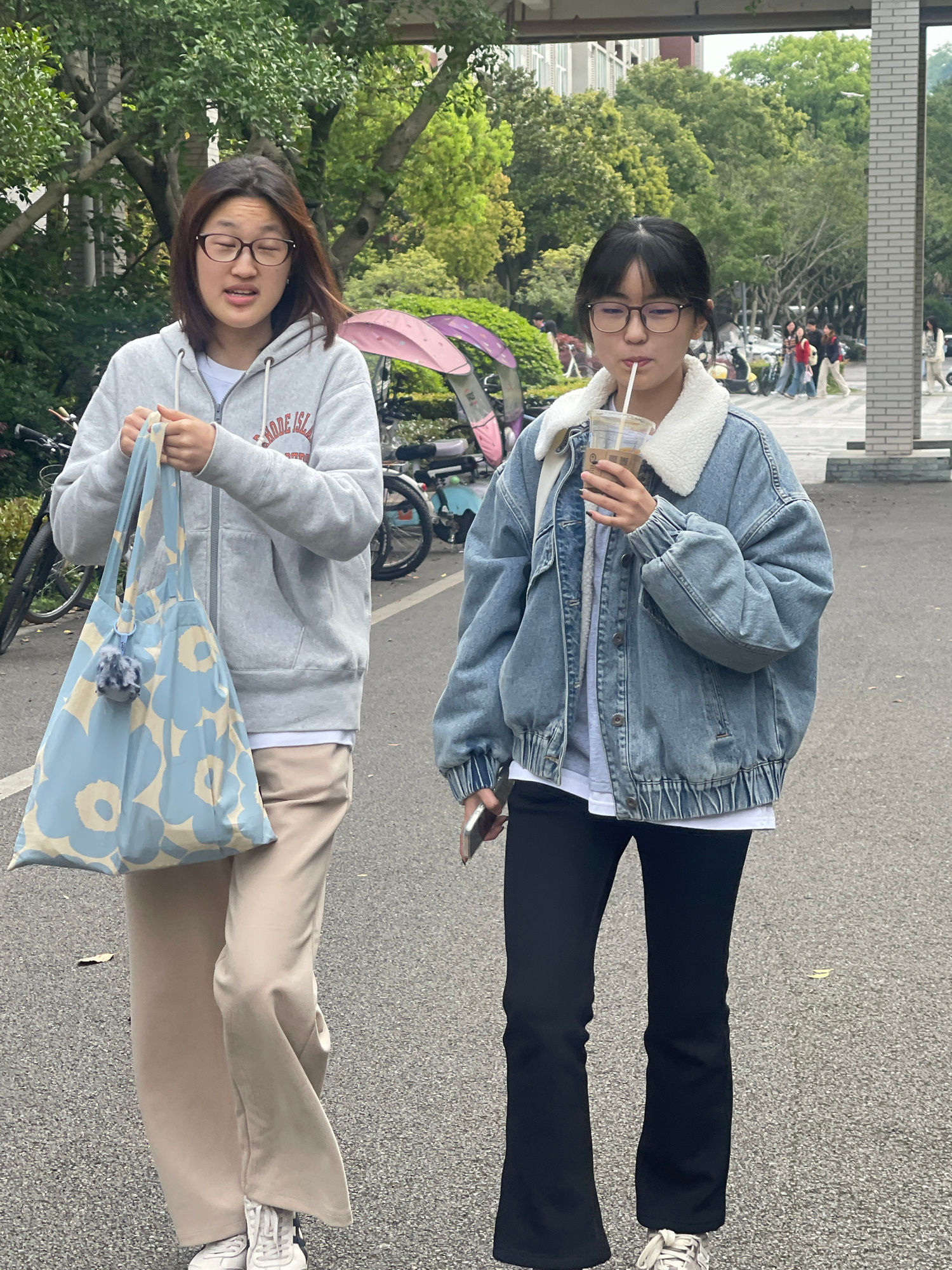 Two women stand on a paved area, likely a sidewalk, surrounded by lush green trees and parked bicycles. The woman on the right wears a denim jacket with a white shearling collar, black pants, and snea…read more