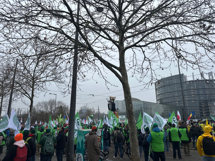 The image depicts a large outdoor gathering or demonstration in Strasbourg, France, directly in front of the European Parliament's Louise Weiss building and an adjacent glass structure. The scene is o…read more
