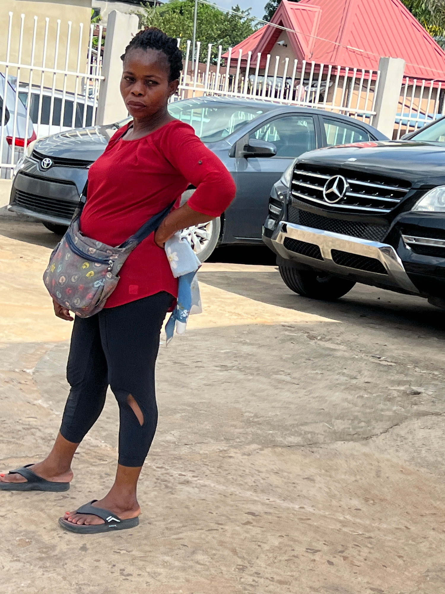The image, originally rotated, depicts a woman standing outdoors in bright daylight. She faces the camera with a neutral expression, wearing a red short-sleeved top and black leggings with cut-outs at…read more