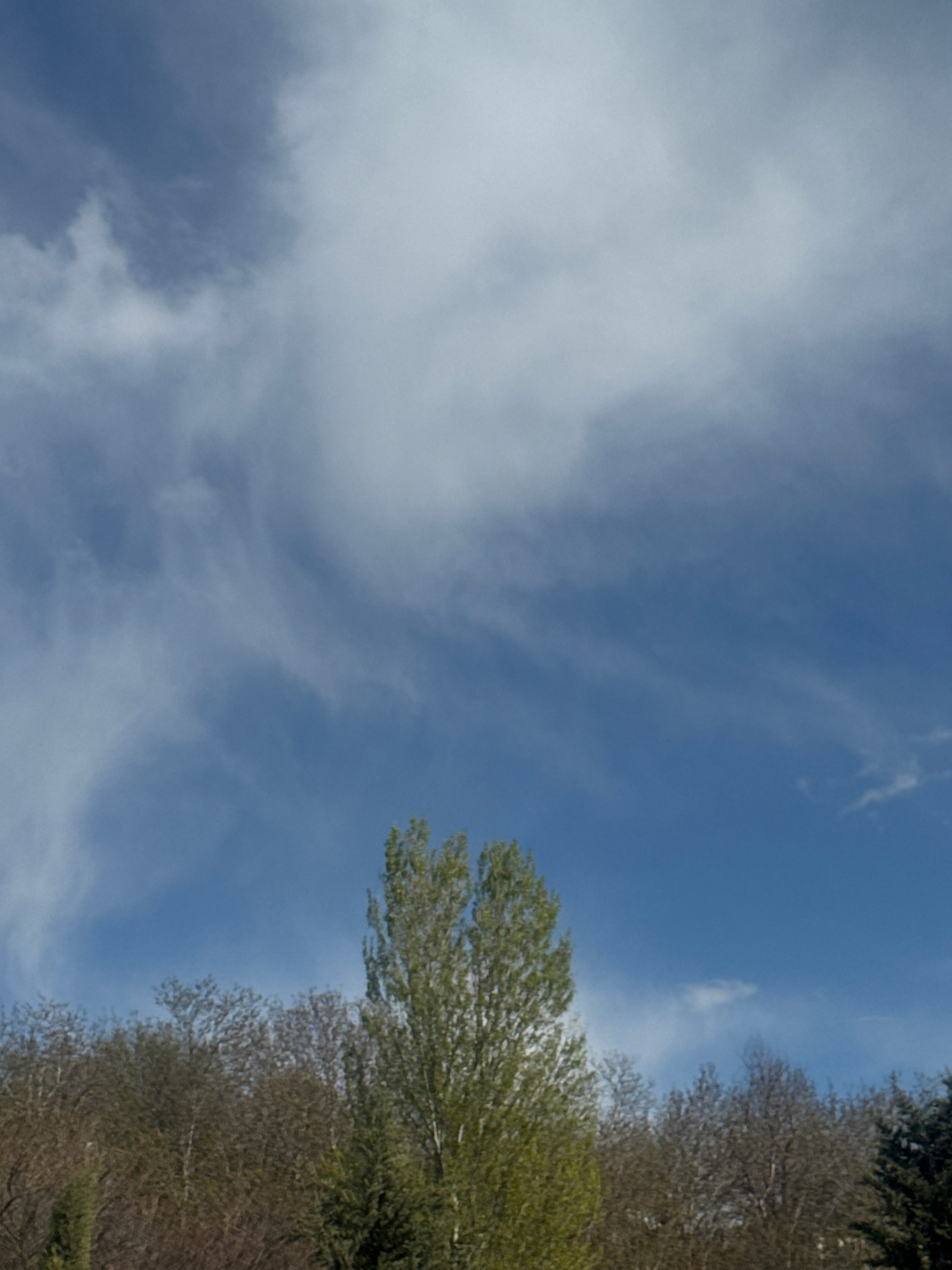 The image shows a sky with blue hues and wispy white clouds. Trees are visible on the right side of the frame, with varying shades of green foliage. The location is not specified, and it is impossible…read more