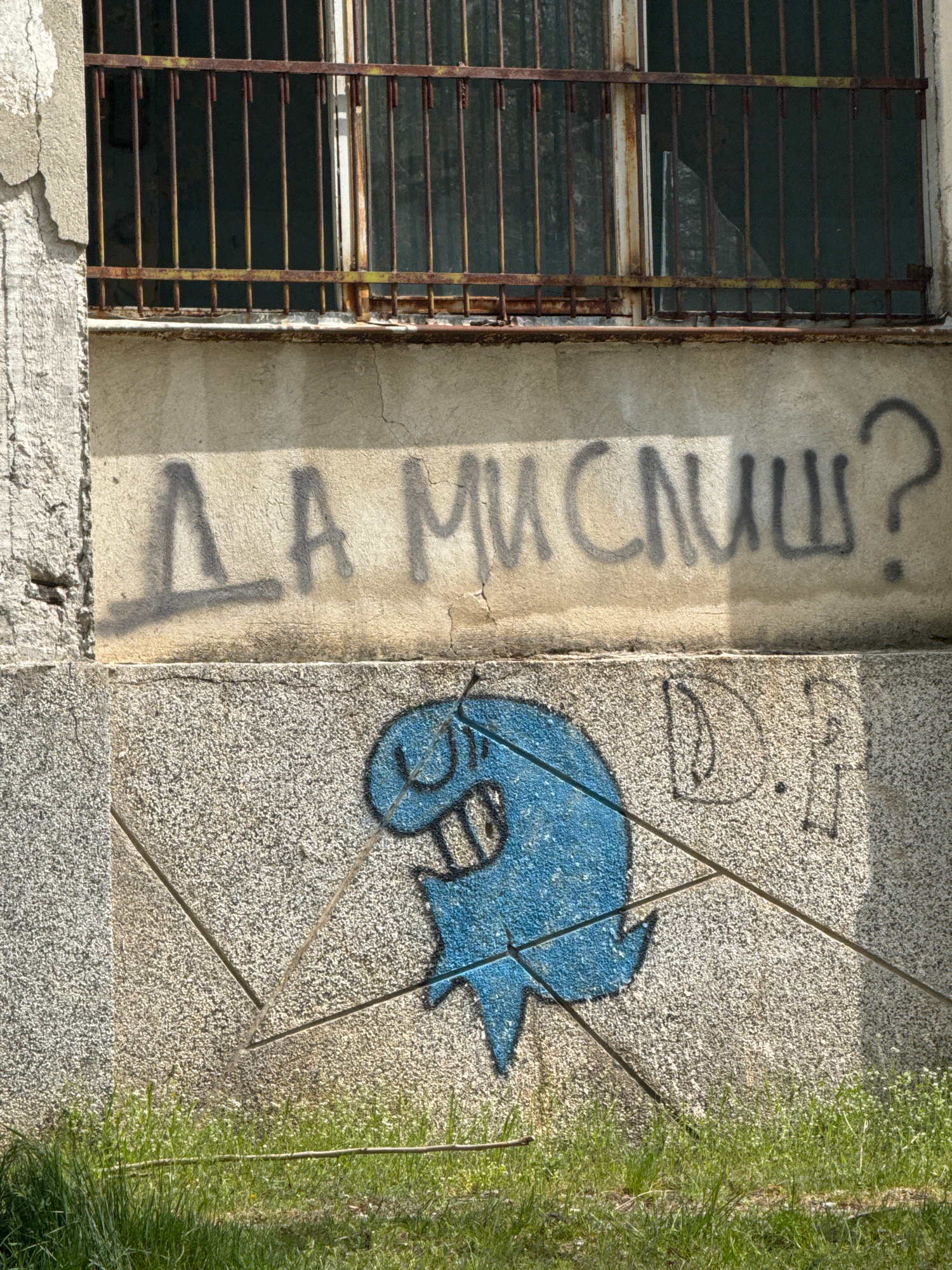A slightly rotated, close-up shot depicts a section of an exterior wall, likely in an urban area, possibly Sopot, Bulgaria, based on the Cyrillic script present. The wall is constructed from textured…read more