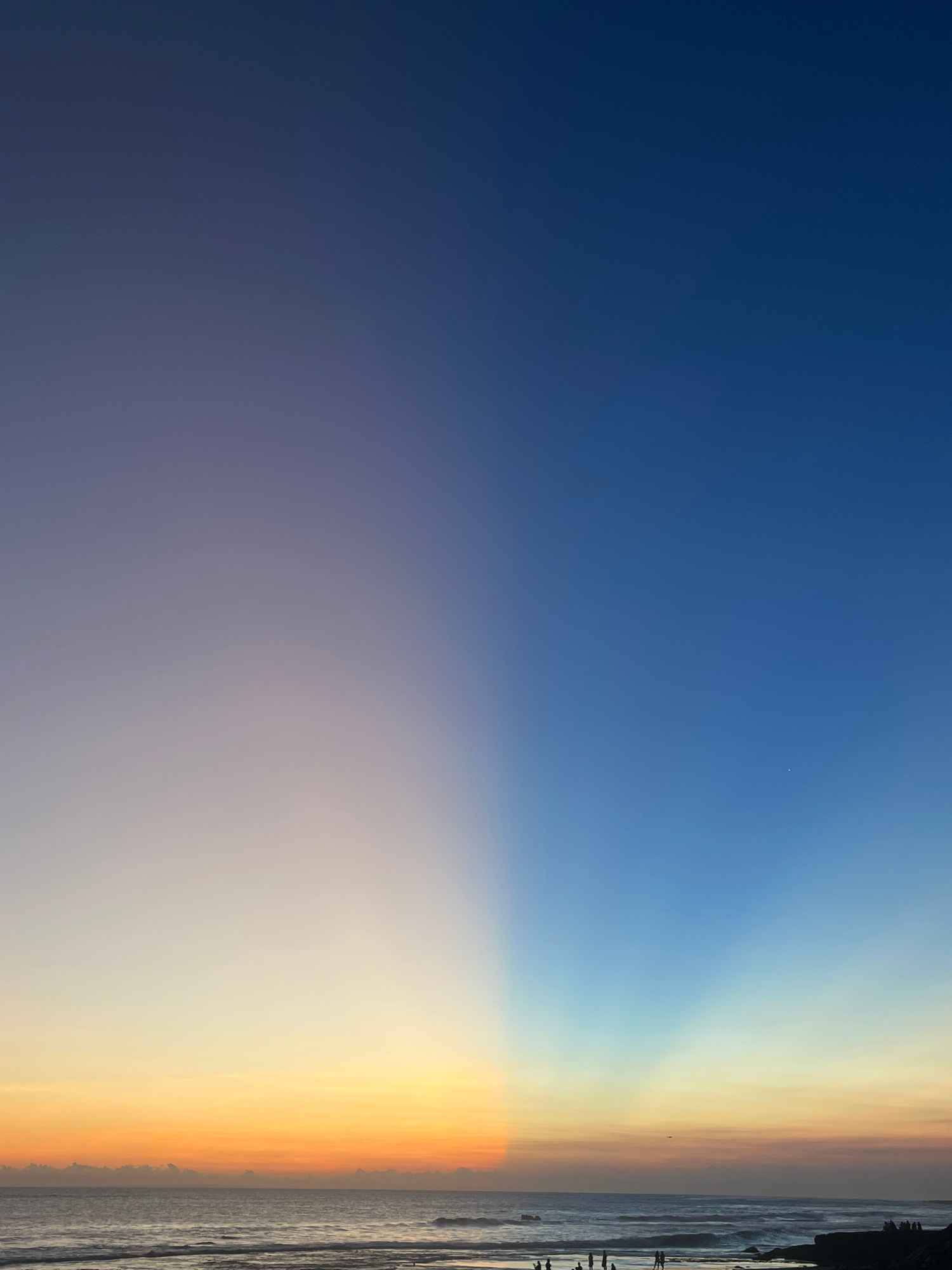 This image captures a breathtaking coastal scene during either sunrise or sunset, presenting a vibrant gradient of colors across the sky. The upper left portion of the sky transitions from a deep, dar…read more