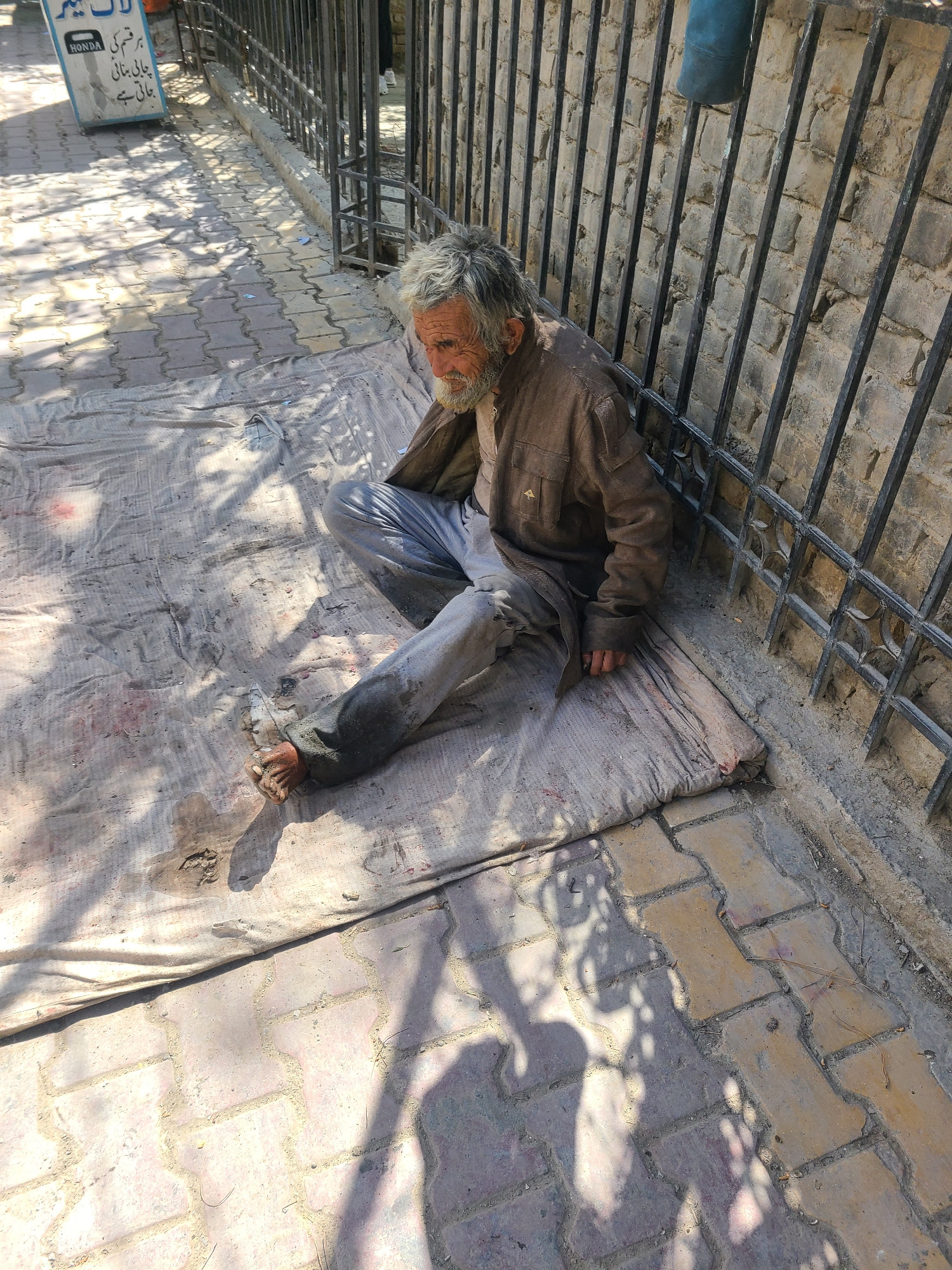An elderly man with grey hair lies on a white cloth on a brick-paved surface next to a metal grate in Quetta City Tehsil, Pakistan. He is wearing a brown jacket and light-colored pants, and his bare f…read more